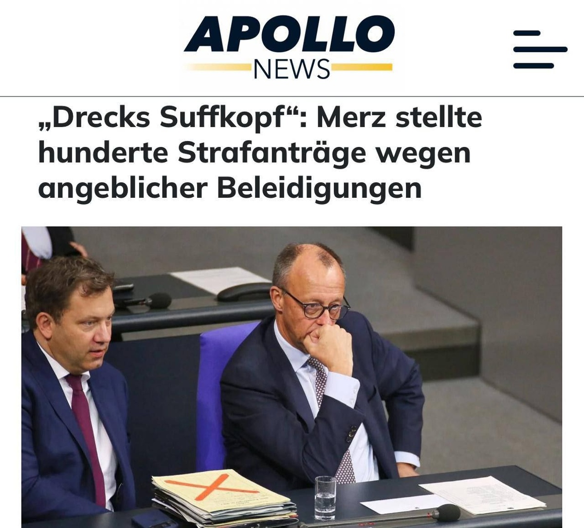 В ответ на пост О как! Мерц подал почти 5 тыс. жалоб на своих интернет-хейтеров Сообщается, что некоторые жалобы канцлера приводили к частично незаконным обыскам. Адвокаты пострадавших отметили «чрезмерную реакцию и произвол». Apollo News приводит в пример дело под названием «маленький нацист». Был изъят телефон женщины-инвалида с еврейскими корнями, которая, как утверждается, сразу признала свою «вину». Также Мерца назвали drecks Suffkopf («грязным пьяницей»). Позже суд признал незаконным обыск, проведенный после этой жалобы канцлера. Сейчас твиты с ненормативной лексикой и хештегом Merz расцениваются прокуратурой Берлина как «политический экстремизм». Это та самая знаменитая свобода слова? 🤣 👍«БайБайден» в МАХ
