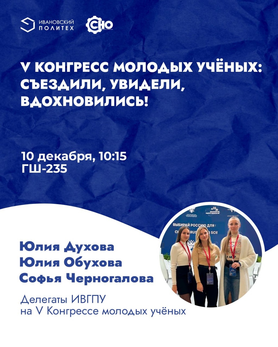 Побывать на главном научном событии страны, представить свой проект среди тысяч коллег и найти единомышленников — это реально! Наши студенты-делегаты только что вернулись с V Конгресса молодых ученых и готовы поделиться с вами уникальным опытом 📢 На встрече вы узнаете: 🔬 Какая атмосфера царила на Конгрессе и какие научные тренды задают тон? 💡 Как Конгресс изменил взгляд ученых на собственные исследования? 🚀 Как попасть на Конгресс в 2026 году? 🗓 10 декабря, 10:15 📍 ГШ-235 Ждем всех, кому интересна наука и свое будущее в ней!