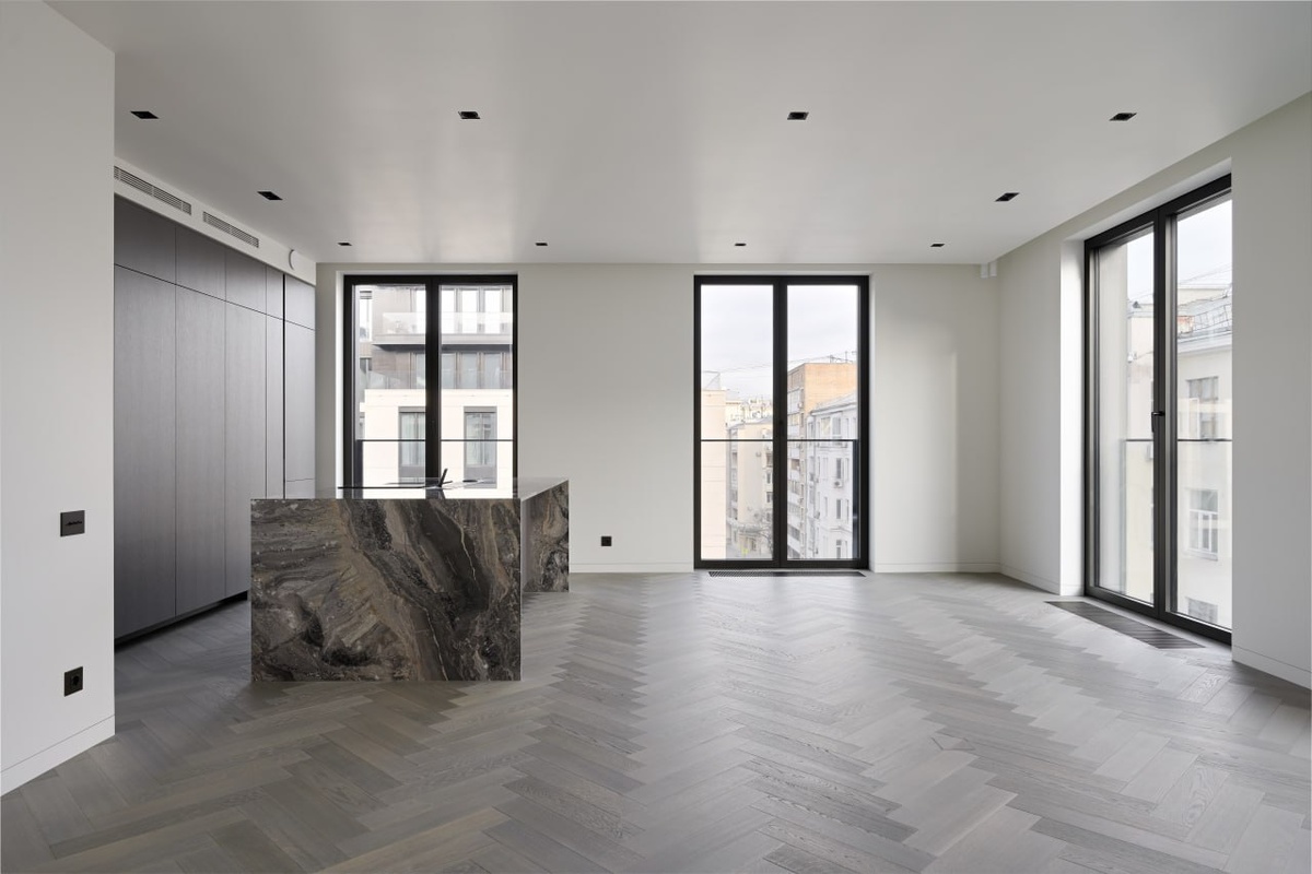 Тишина в центре города | Квартира с 2 спальнями, 124.8 м² Пространство, где город растворяется, а время следует вашему ритму. Здесь день начинается с сияния, льющегося из панорамных окон, а вечер приносит ощущение уюта и спокойствия. Эта планировка создана для тех, кто ценит баланс между открытостью и уединением. В квартире полностью продумана организация жизни: — Главная спальня площадью 22.5 м² с собственной ванной комнатой и гардеробной — Вторая спальня 11.66 м² — Два санузла, постирочная, интегрированные системы хранения — Сердце квартиры — кухня-гостиная 53.8 м² для общения, встреч и уютных вечеров — Из окон комнат открывается вид на двор-сад, а в кухне-гостиной также и на Костянский переулок. Финишная отделка TURGENEV — это сочетание натуральных материалов и безукоризненного исполнения. В основе — австрийский паркет Austriawood и итальянский мрамор Wooden White. Квартира оборудована кухней Cesar (Италия) и премиальной техникой Smeg. Все детали формируют среду, в которой каждый