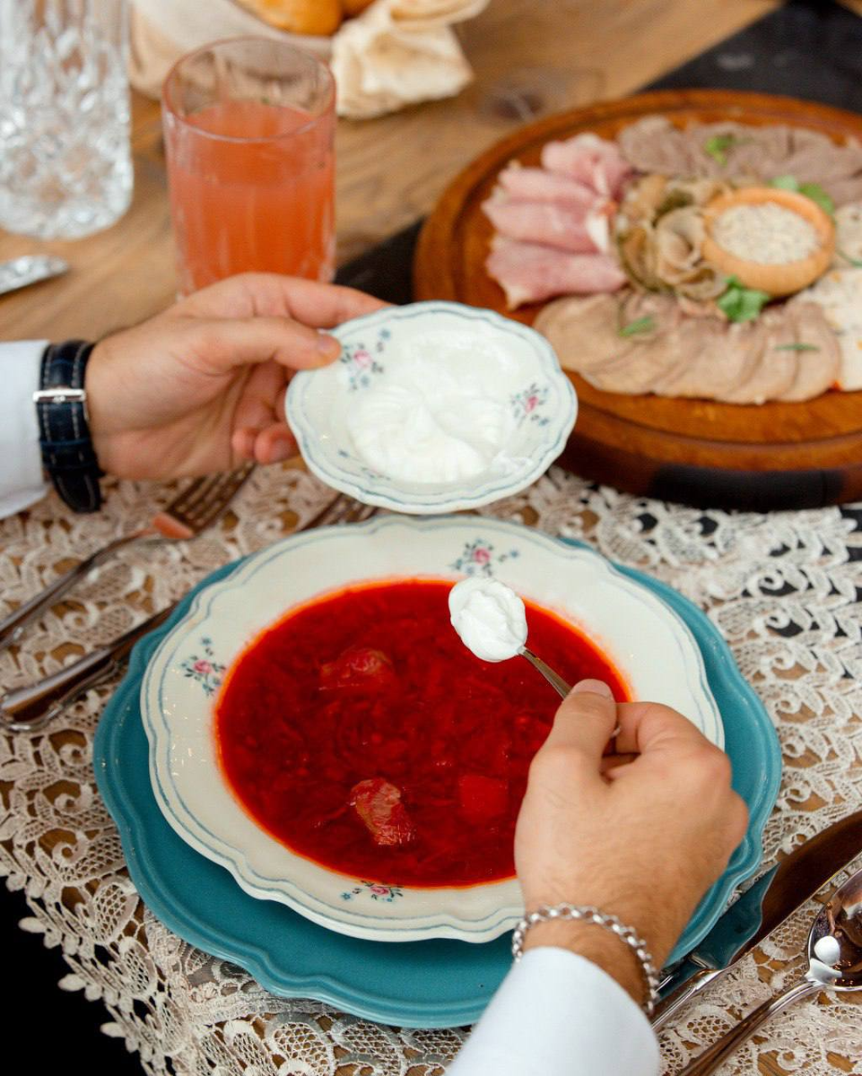 В тарелке одновременно: крепкий жирный бульон, обжаренные овощи (лук, морковь, свёкла) в масле или сале и сверху — густая сметана. Для вкуса — идеально, для поджелудочной после 40 — перегруз по жирам и калориям, особенно если это вечерний приём пищи. С годами ферментные возможности снижаются: поджелудочной сложнее переварить сразу много жирного и густого.