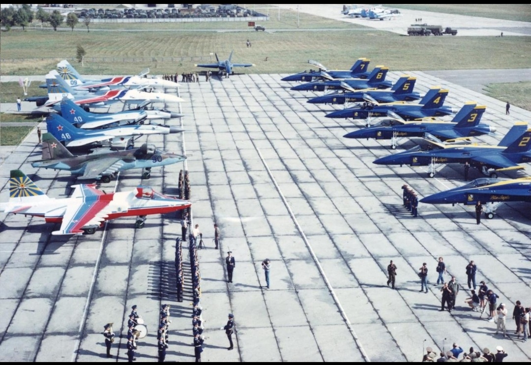 История авиации знает немало моментов, когда политика отступала перед профессиональным братством пилотов. Одним из самых ярких и символичных таких эпизодов стала короткая, но незабываемая визит американских «Голубых Ангелов» (Blue Angels) в подмосковную Кубинку в начале сентября 1992 года. Это было уникальное время. Холодная война официально закончилась, воздушное пространство бывшего противника стало открытым, а между двумя великими авиационными школами возникло взаимное любопытство, граничащее с уважением. И Военно-морские силы США отправили своих лучших — группу высшего пилотажа на грозных истребителях F/A-18 «Хорнет». Уже на подлёте к Москве американцев ждал первый сюрприз и знак высшего уважения. Их не просто взяли под контроль диспетчеры, а личным эскортом сопровождали российские истребители — легендарные Су-27 из пилотажной группы «Русские Витязи» и МиГ-29. Силуэты «Хорнетов» и «Сухих», всего несколько лет назад считавшихся заклятыми противниками, теперь мирно следовали од
