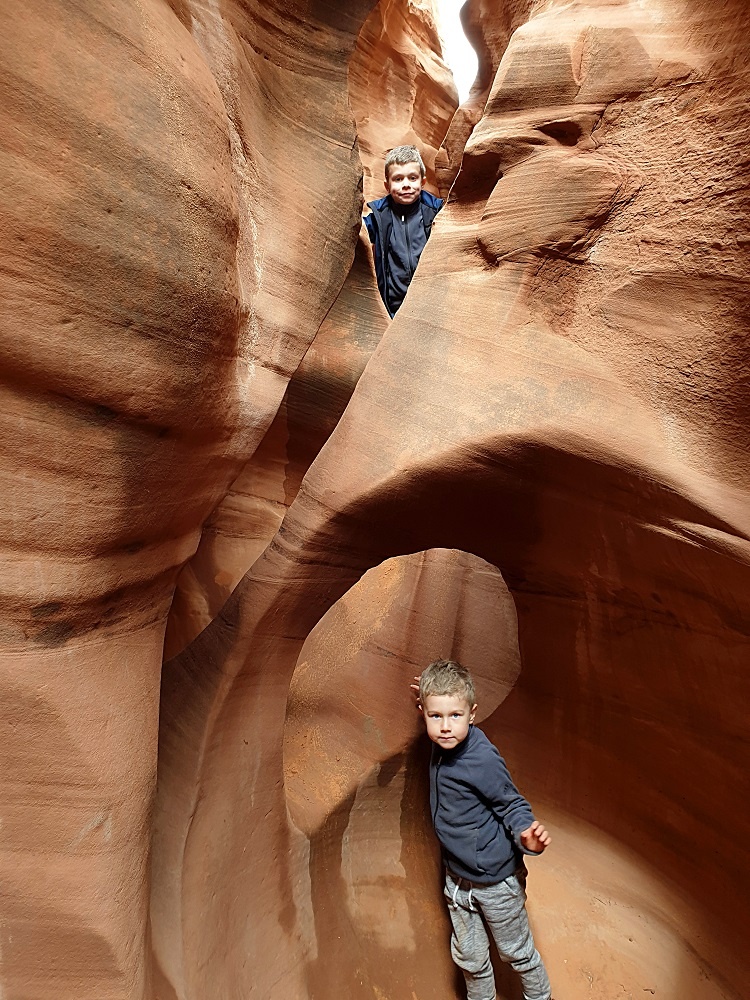 После преодоления водной преграды мы практически сразу достигли конца «Спуки». На выходе был камень, похожий на тот, который придавил героя в фильме «127 часов». Именно столько он провел в слот-каньоне, пока не отпилил себе руку. Фильм был снят по реальной истории. Правда, произошла она не в «Спуки», а в 50 километрах от него в каньоне «Голубого Джона». Я предложил Анне разместиться под этим камнем, чтобы сфотографироваться — она решительно, я бы даже сказал резко, отказалась.