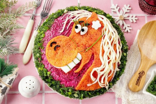 Салат с символом 2026 года — Красной Огненной Лошади, станет эффектным украшением новогоднего стола! Состав / Ингредиенты: Больше рецептов в моем Телеграмм - канале https://t.me/vkysnolov ДЛЯ САЛАТА : Морковь -1 штука Свекла -1 штука Яйцо 2- штуки Лук 1- штука Сельдь - соленая 300 грамм (филе) Картофель- 3 штуки Майонез- По вкусу Соль По вкусу Перец По вкусу УКРАШЕНИЕ : Морковь -1 штука Белок куриного яйца- 1 штука Укроп -1 штука Маслины -1 штука (без косточек) Сыр косичка По вкусу Количество порций- 8 Приготовление: 1. Подготовьте все ингредиенты по списку. Картофель, свеклу, морковь и яйца отварите заранее. Дайте остыть. Сельдь разберите на небольшие кусочки, удаляя все косточки. 2. Картошку очистите и натрите на тёрке с крупными ячейками. Выложите на плоское круглое блюдо. Посолите и смажьте майонезом. 3. Филе сельди мелко нарежьте и покройте слой картошки. Можно взять уже готовое филе. Но если вы решите разделать сельдь сами, то тщательно уберите все косточки. 4. На селёдку выло