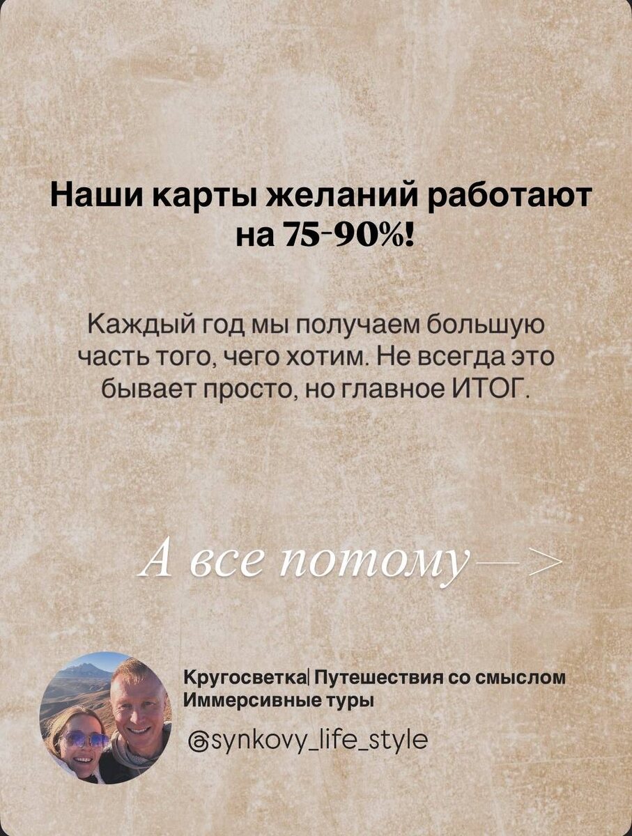Карта желаний: просто развлечение или стратегия, которая работает. ❌Можно и просто развлечься… Как в детстве стенгазеты, коллажики, аппликации. Отличный новогодний досуг под бокал шампанского и мандаринку с подружками, детьми или в семейном кругу. Даже МК в кафешках делают и на холсте рисуют. Только это останется просто картинкой. ‼️А можно и СЕРЬЕЗНО. Время то же, а польза на год вперед как минимум. НО.. это уже не развлечение. В прошлом году мы делали коучинговую карту желаний в научном подходе на стыке арт терапии, нейролингвистики и коучинга. В результате: 🚀Блоги на всех платформах выросли с 2500 до 10000 (несмотря на все ограничения) 🚀Мы все же отправились в Индию и провели лето в горах (хотя были проблемы с оформлением визы, а потом и вовсе в Кашмире война началась) 🚀Я получила сертификат университета Berkeley (несмотря на то, что нас отрезали от всех иностранных сайтов и платформ и я планировала Harvard) 🚀А еще я отрастила волосы моей мечты детства (хотя мне все гов
