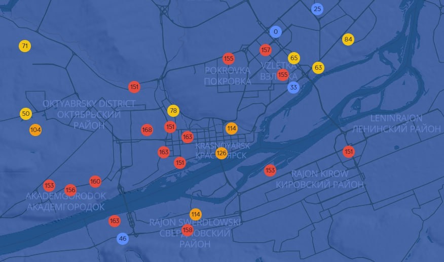 Прямо сейчас датчики общественников показывают загрязнение воздуха в нескольких районах – Свердловском, Ленинском, Октябрьском, а также в