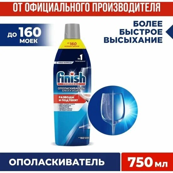 Finish Блеск и защита — незаметный помощник, который делает посудомоечную машину по-настоящему заботливой: стекло сверкает, серебро и столовые приборы сохраняют блеск, а посуда выходит из машины сухой и без пятен. Флакон 750 мл — экономичный объём для семьи или активного использования в офисе.