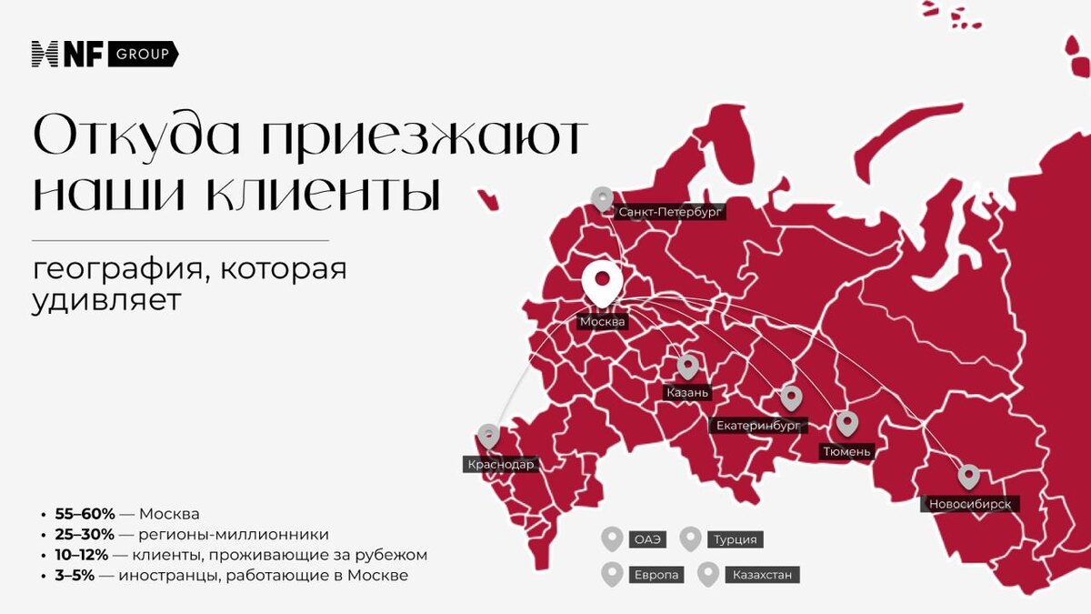 Недавно мы визуализировали географию наших клиентов и карта показала: рынок элитной загородной недвижимости Подмосковья давно перестал быть локальным московским явлением. Смотрите на карту выше, каждая точка на ней — это город, откуда к нам приезжают покупатели. Москвичи по-прежнему составляют большинство клиентов. Это предприниматели, топ-менеджеры, представители творческих профессий, для которых загород — не дача на выходные, а полноценный формат жизни. Екатеринбург, Казань, Краснодар, Тюмень, Новосибирск. Владельцы бизнеса, которые открывают офисы в Москве или живут между двумя городами. Их привлекает то, чего нет в регионах: инфраструктура западного направления, премиальные школы, готовые дома с авторской архитектурой. Наши соотечественники из ОАЭ, Турции, Казахстана, Европы. Для них загородный дом — летняя резиденция и точка связи с Россией. Например, недавно семья из Дубая выбирала объект на Новой Риге с участком на уклоне, который напоминал бы виллу в Испании. Архитектура и прив