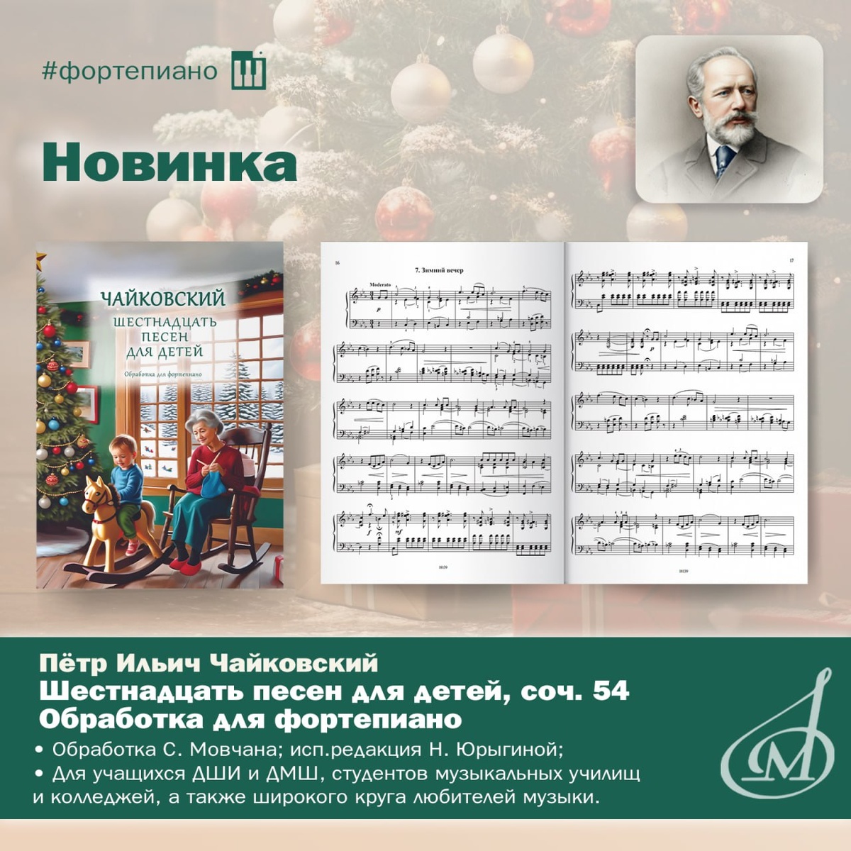 ✨ Новинка: П. Чайковский. «Шестнадцать песен для детей», соч. 54. Обработка для фортепиано С. Мовчана, исполнительская редакция Н. Юрыгиной Не устаём вдохновляться творчеством П. И. Чайковского! Новый сборник детских пьес уже ждёт юных пианистов. 🔘Сложно найти пианиста, который бы не начинал свой путь с пьес из «Детского альбома» Чайковского, ведь они стали неотъемлемой частью педагогического репертуара. Чтобы пополнить его прекрасными мелодиями композитора, педагоги Московской консерватории — композитор, доцент Сергей Мовчан и пианистка, профессор, заслуженная артистка России Наталья Юрыгина — создали сборник фортепианных пьес на основе вокального цикла «Шестнадцать песен для детей», соч. 54 🔘Большая часть песен цикла была написана композитором в октябре 1883 года в имении Каменка, принадлежавшем семье его сестры. Работа увлекала Чайковского: «Я пишу теперь сборник детских песен, о коем уже давно помышлял. Работа эта очень увлекает меня, и кажется, что песенки эти выходят удачно»
