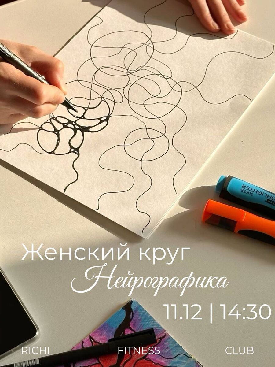 Нейрографика в Richi Fitness Club 🍏 Приглашаем тебя на новогодний женский круг-терапию — мастер-класс по нейрографике 🎨 Мы будем рисовать свои цели, отпускать тревоги и создавать своё будущее на бумаге 🙌🏻 Это время, где ты: 💚 Почувствуешь, чего на самом деле хочешь от 2026 💚 С помощью рисования снимешь зажимы и напряжение 💚 Создашь красивую карту движения к своей цели 💚 Унесёшь домой работающий инструмент для исполнения желаемого Нейрографика — это не просто рисунок. Это способ мягко договориться со своей психикой о том, куда ты хочешь двигаться. Тёплая атмосфера, творчество, девичье вдохновение — и правильный настрой на хороший год ✨ Записывайтесь — проведём этот день красиво и осознанно, участие бесплатное. Запись: n882474.yclients.com/group-events-widget