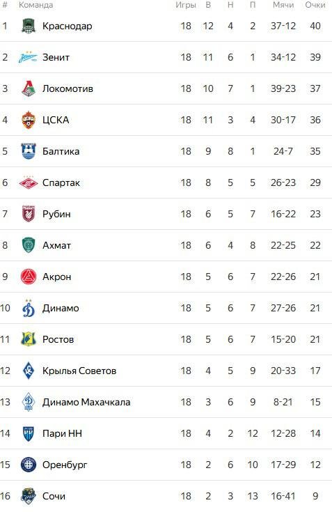 Все матчи в этом календарном году сыграны, 18 туров позади: "Краснодар" и "Зенит" в группе лидеров, "Локомотив" и "ЦСКА" чуть позади. Открытие сезона - "Балтика", все еще имеет реальные шансы на борьбу за титул. В целом, кажется снова, интрига будет идти до последнего тура, плотность в группе лидеров очень высокая.