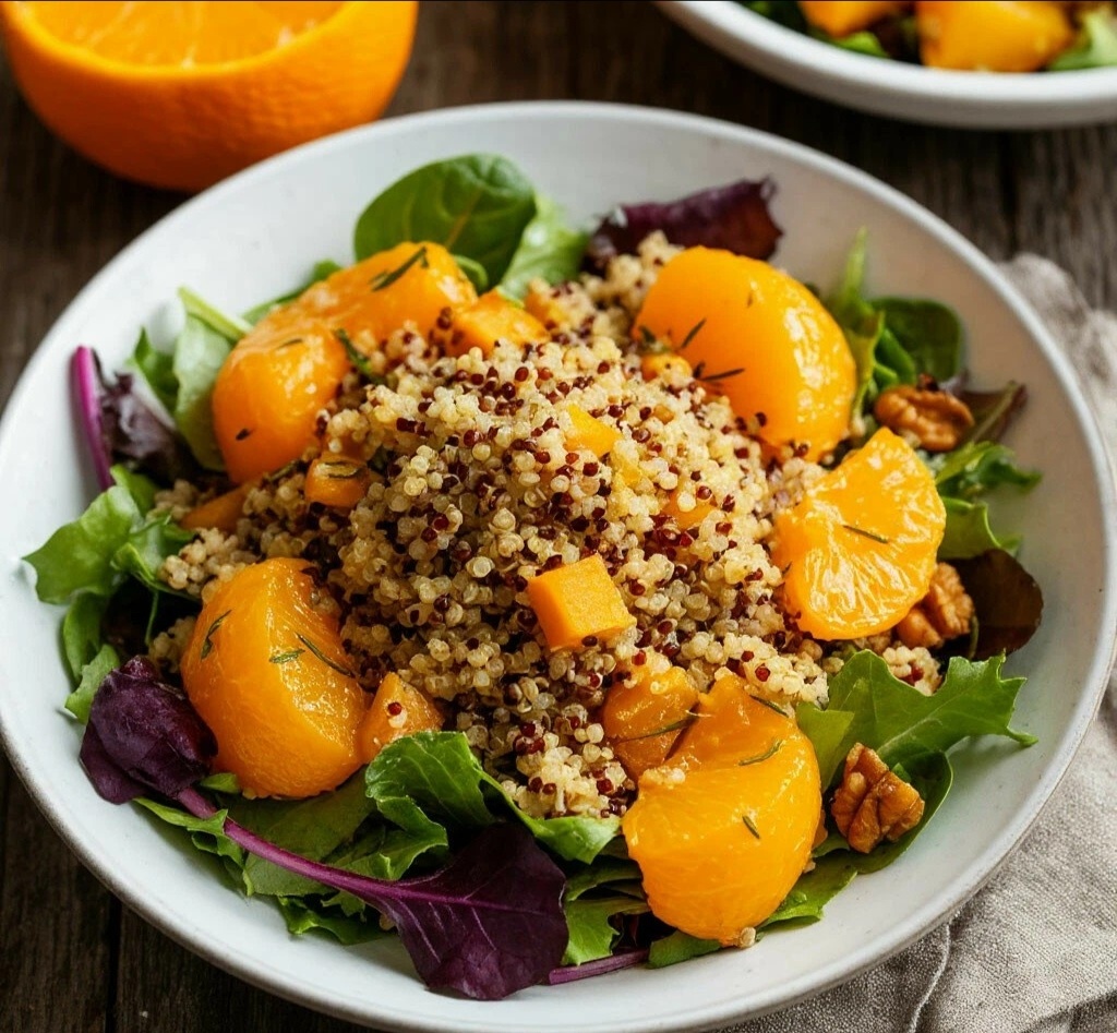 САЛАТ — ИЗ ПЕЧЁНОЙ ТЫКВЫ С КИНОА И АПЕЛЬСИНОВОЙ ЗАПРАВКОЙ Мур-мур, мои любители солнца в тарелке! 😺🎃 Когда за окном серый понедельник, нам нужно создать своё собственное светило! Этот салат — как луч осеннего солнца: сладкая запечённая тыква, лёгкая киноа, рубиновая заправка и хрустящие семечки. Витаминный взрыв и море хорошего настроения! 🌞🧡 САЛАТ ИЗ ПЕЧЁНОЙ ТЫКВЫ С КИНОА И АПЕЛЬСИНОВОЙ ЗАПРАВКОЙ ИНГРЕДИЕНТЫ (на 2 порции): 🧾 ·Тыква (мускатная или Хоккайдо) — 300 г 🎃 ·Киноа — 60 г (сухой) ·Руккола — 50 г 🥬 ·Сыр фета — 80 г 🧀 ·Тыквенные семечки — 2 ст. л. ·Для заправки: оливковое масло — 3 ст. л. 🫒, свежевыжатый апельсиновый сок — 2 ст. л. 🍊, бальзамический крем — 1 ч. л., цедра ½ апельсина, соль, перец. ВРЕМЯ ПРИГОТОВЛЕНИЯ: ⏰ 35 минут СЛОЖНОСТЬ:🐾 Нужно подождать, пока запечётся тыква ПОШАГОВЫЙ РЕЦЕПТ: 👩🍳 1. Духовку разогреть до 200°C. Тыкву очистить, нарезать кубиками 2 см, сбрызнуть маслом, посолить. Запекать 20-25 минут до мягкости. 🔥🎃 2. Киноа отварить согласно