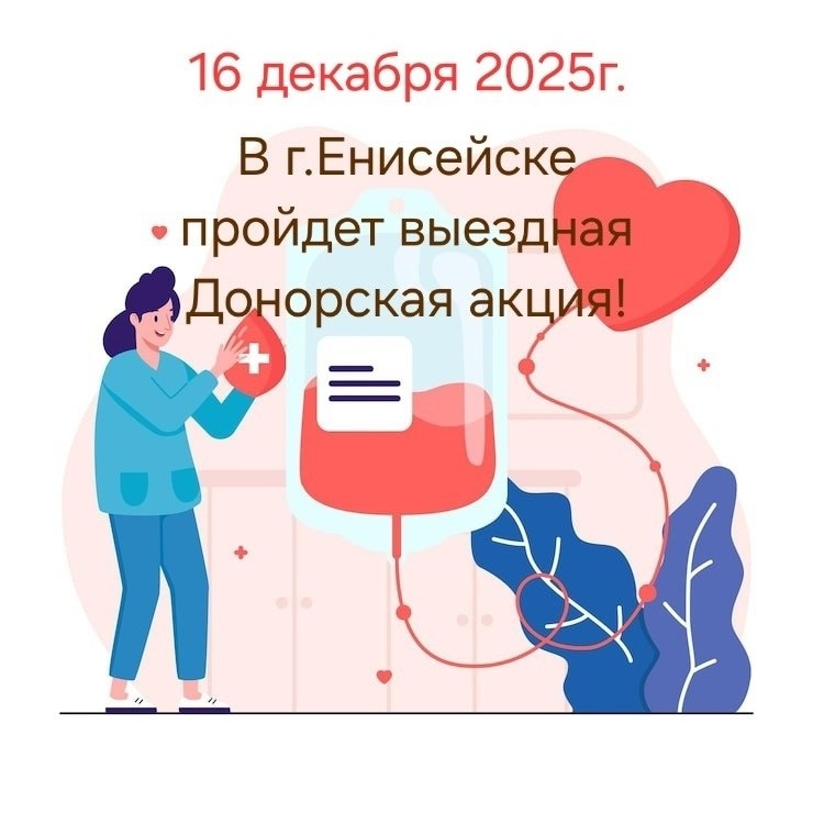 Уважаемые жители г.Енисейска! 16 декабря 2025 года будет проводиться забор крови доноров по адресу ул. У.Громовой д. 17/1 КГБУЗ "Енисейская РБ" Взрослая поликлиника 2 этаж кабинет 2-18 с 8.30 до 13.00ч Приглашаем всех желающих! При себе иметь паспорт и СНИЛС. (лёгкий завтрак приветствуется)