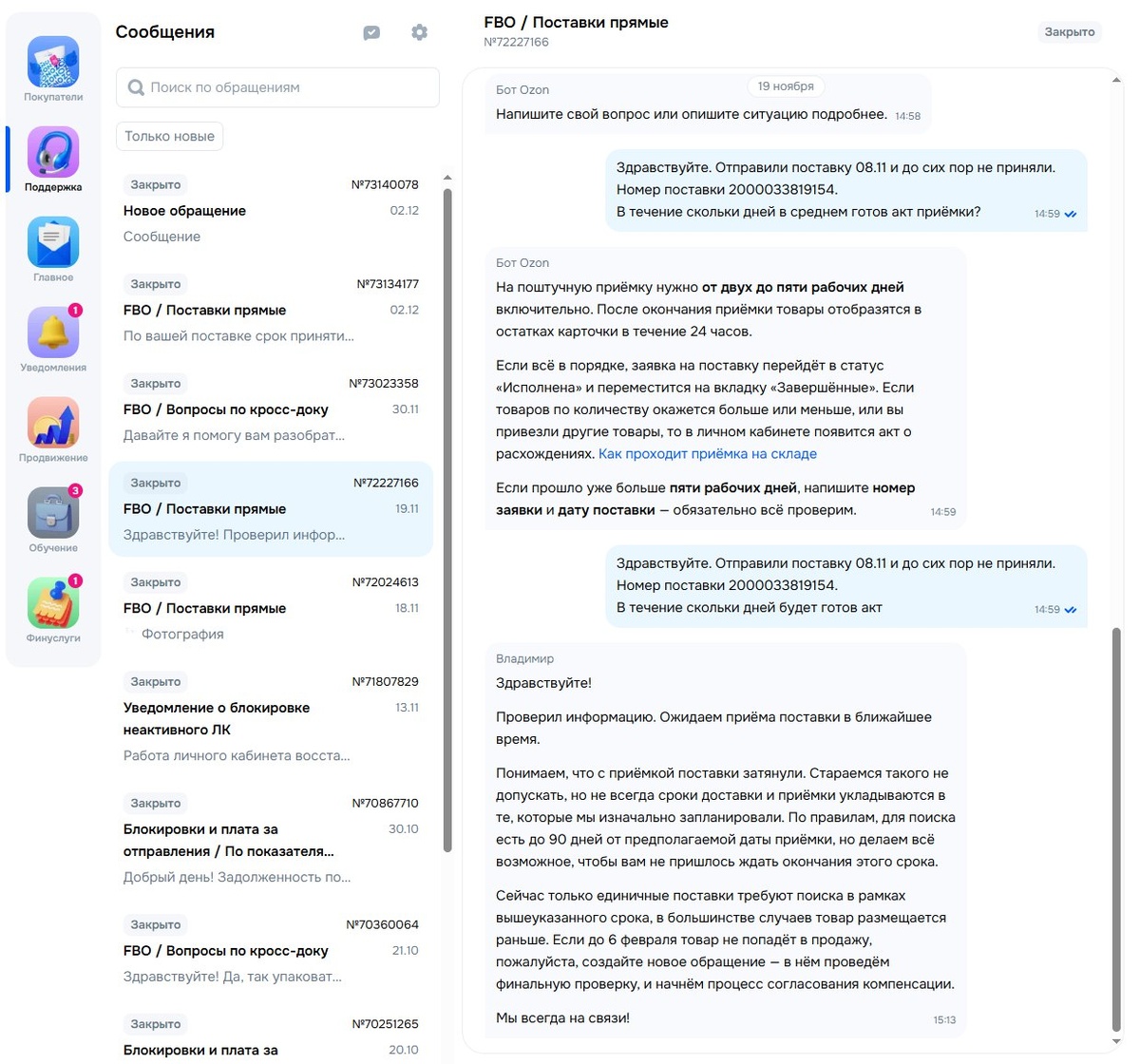 И так. Мы собрали первую поставку. Состояла она из 7 наименований, количеством 60 шт. Я отнёс ее 8 ноября на ПВЗ в моём доме, для отправки на склад ПВЗ Софьино. На сегодняшний день она еще не принята складом. Обычно доставка и приёмка занимает до 5 рабочих дней. Естественно от поддержки нет нормального ответа, по какой причине товар не принят. Их ответ прикреплю скрином.