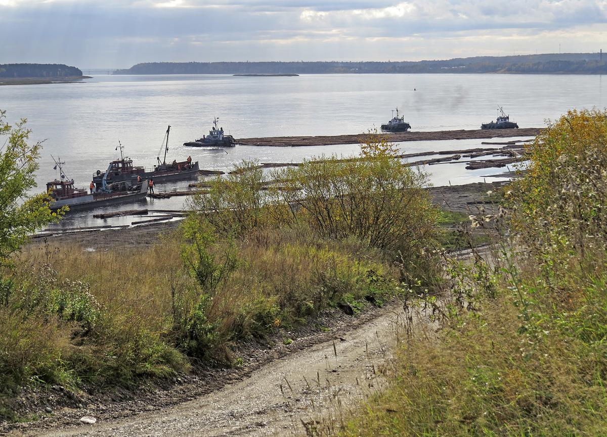 В индустриальном Лесосибирск, выйдя на берег Енисея, мы увидели на фоне далёкого моста вот такую картину: Ведь у дерева положительная плавучесть, и стало быть, зачем грузить его на железную баржу? В царские и советские годы в России практиковался молевой сплав - то есть, брёвна просто скидывали в реку, а там уж как доплывёт. Особенно славились им притоки Камы - отсюда и гигантский Керченский рейд под Чердынью. На Вишере я видел ряжи для сортировки молевого леса, и даже чуть ниже Перми в моём детстве дедушка и бабушка за считанные дни наловили с лодки брёвен на новую баню. Но серьёзной проблемой был и топляк, о которой бились не только лодки, но и суда вроде скоростных "Метеоров", а его гниение отравляло реку похлеще всяких промышленных стоков. Лучше соединить брёвна в плот, а в идеале ещё и загнать плот в кошель - боновое заграждение, прицепленное к буксиру. Молевой сплав в России запретили в 1995 году, а плотовой в 21 веке стал экзотикой - из крупных рек он практикуется сейчас тольк