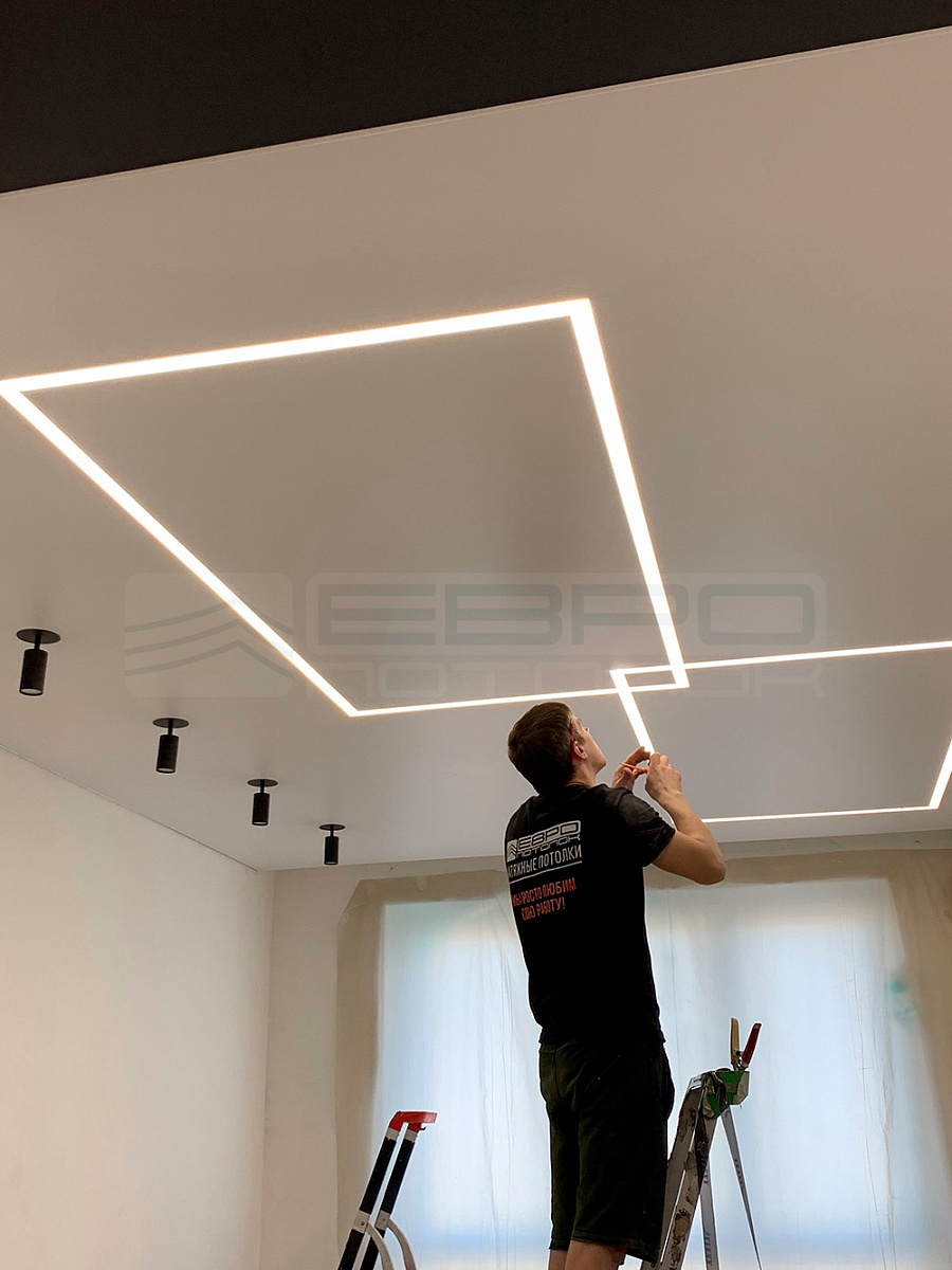 - Сложная геометрия: Линии могут переходить со потолка на стены, образуя световые кольца, дуги или любые другие фигуры. Это модный тренд, требующий точной стыковки материалов.