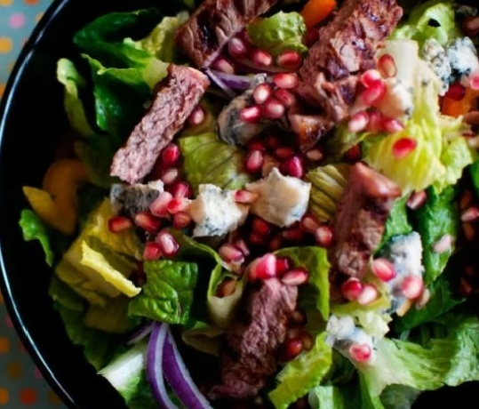 Этот салат получается сбалансированным: мясо даёт сытность, гранат — свежесть и сладость, орехи — текстурный контраст, а заправка на основе гранатового соуса связывает все вкусы воедино. Ингредиенты (на 2-3 порции): Для мяса: · Свинина (вырезка, корейка или шея) — 300-400 г · Соевый соус — 2 ст. л. · Мёд (или коричневый сахар) — 1 ст. л. · Чеснок — 1-2 зубчика · Растительное масло для жарки · Соль, чёрный перец по вкусу Для салата: · Гранат — 1 крупный (или 100-150 г готовых зёрен) · Грецкие орехи — 70-100 г · Руккола или смесь салатных листьев (шпинат, корн) — 1 большой пучок · Сыр с голубой плесенью (дор-блю, горгонзола) или фета — 50-70 г (по желанию, но очень рекомендую) · Красный лук — ½ небольшой луковицы Для заправки: · Гранатовый соус (наршараб) — 3 ст. л. · Оливковое масло — 2 ст. л. · Бальзамический уксус или сок лимона — 1 ч. л. · Соль, перец по вкусу Приготовление: 1. Подготовка свинины. · Мясо промокните салфеткой, нарежьте на небольшие кусочки (брусочки или ку
