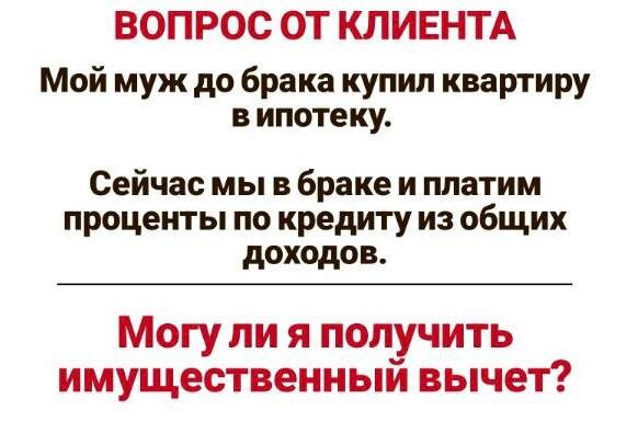 😋😌😌😉😌😌😌😍 Квартира куплена одним из супругов (мужем) до регистрации брака и оформлена на него. Платежи по ипотеке продолжаются и после свадьбы. Причём оплачиваются из общих доходов обоих супругов. ❓Может ли второй супруг (жена) претендовать на имущественный вычет ДАВАЙТЕ ПО ПОЛОЧКАМ ❓Кто имеет право на вычет по закону? Право на имущественный вычет при покупке жилья возникает у собственника, который несет расходы на его приобретение. Поскольку квартира была куплена до брака, она является не совместной, а личной собственностью того, на кого оформлена. Вывод: Право на основной вычет в соответствии с п.3 ст.220 НК РФ (со стоимости квартиры) имеет только тот супруг, который числится собственником и покупателем по договору. 💡В нашем случае только муж, так как он и платил и покупал, жена никакого отношения к покупке не имела. ❓А как же проценты по ипотеке? А вот здесь начинается самое интересное. Многие сейчас скажут, что логично предположить, если ипотечные платежи (включ