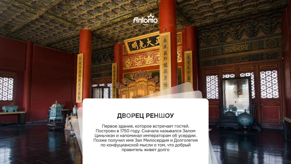 Каждая деталь — от рисунков на балках до формы мостов — не просто украшение, а символ. Именно так правители представляли гармоничный мир, в центре которого — порядок, долголетие и связь человека с природой. Если вы планируете путешествие в Китай или ищете места, куда стоит поехать впервые, Летний дворец — идеальный вариант. Он огромный, атмосферный и позволяет буквально пройтись по страницам истории. Дворец Реншоу: вход в мир императорской власти Это первое здание, которое видит каждый посетитель. Построенный в 1750 году, зал изначально назывался Циньчжэн — «Усердное управление». Его задача была напомнить императору о долге перед страной. Позже, при императоре Гуансюе, зал получил новое имя — Зал Милосердия и Долголет