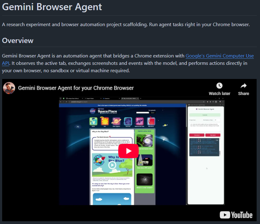 Gemini Browser Agent — это автоматизированный open-source инструмент, который связывает расширение Google Chrome с API Google Gemini. Этот агент использует модель Gemini 2.5 Computer Use для наблюдения за активной вкладкой, позволяя выполнять сложные, многоступенчатые задачи и автоматизировать действия в браузере. Он осуществляет обмен скриншотами и событиями с моделью, обеспечивая полноценный "зрительный" контроль веб-интерфейса. Проект предоставляет удобный способ автоматизации действий в браузере, позволяя пользователям легко интегрировать возможности искусственного интеллекта в свои рабочие процессы. * Визуальный контроль браузера: Агент использует снимки экрана активной вкладки, чтобы "видеть" и интерпретировать веб-страницу, имитируя человеческое восприятие. * Автоматическое выполнение действий: Модель генерирует и выполняет необходимые действия в браузере, включая клики мышью, ввод текста, прокрутку страницы и навигацию по ссылкам. * Решение сложных задач: Позволяет автоматизиро