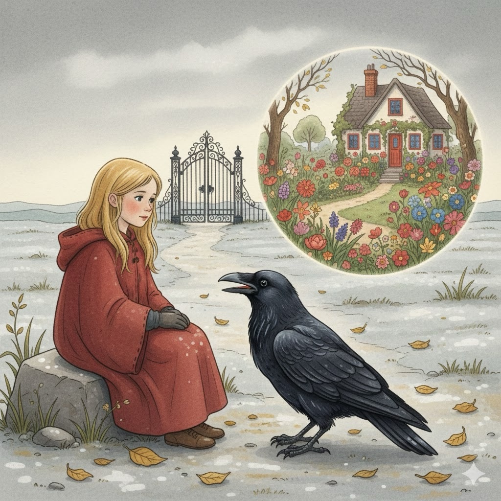 Пришлось Герде опять присесть отдохнуть. На снегу прямо перед ней прыгал большой ворон. Долго смотрел он на девочку, кивая ей головою, и наконец молвил: