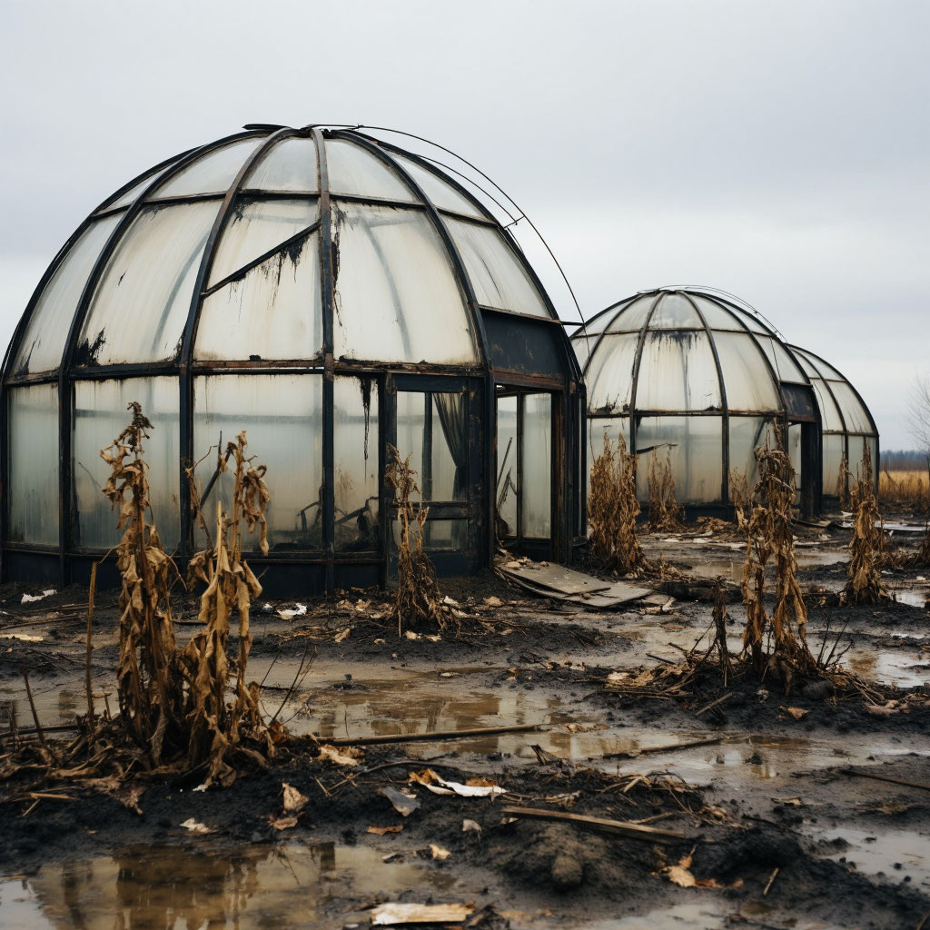 Через час показались первые признаки «Флоры». Не зелени, конечно. Огромные, полуразрушенные купола из оргстекла и поликарбоната, почерневшие от времени и выгоревшие на солнце. Под ними угадывались причудливые очертания мёртвых ферм, застывших в последнем, вечном урожае металлических стеблей и пластиковых листьев. Воздух пахнет не землёй и не гнилью, а химической тоской — застывшим запахом удобрений и озона.