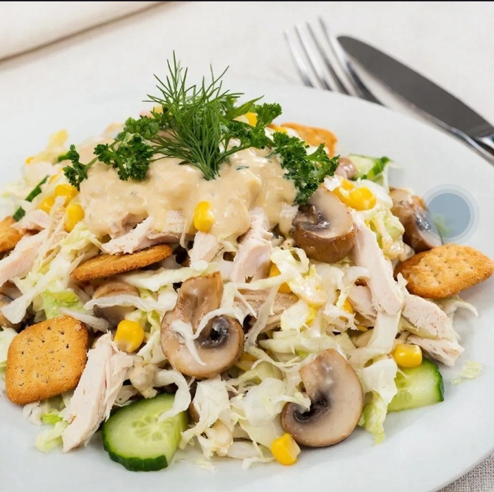 Ингредиенты: - Копченая грудка — 200 г - Помидоры — 2-3 шт. - Огурцы — 2 шт. - Лук красный — 1 шт. - Сыр твердый — 100 г - Майонез , горцица, чеснок— по вкусу - Соль, перец — по вкусу - Зелень (укроп, петрушка) — для украшения - Грибы, шампиньоны 300 гр - Капуста белокочанная 300 гр - Кукуруза консервированная - 1б - Сухарики ( со вкусом чеснока)- для украшения. Приготовление: 1. Подготовка ингредиентов: - Копченую грудку нарежьте тонкими полосками или кубиками. - Помидоры и огурцы нарежьте кубиками. - Лук нарежьте полукольцами. - Сыр натрите на крупной терке. - Грибы обьжарьте до готовности. - Корейскую морковь не сильно мелко порубите. - Нашенкуйте белокочанную капусту - Откройте банку консервированной курукузы и слейте жидкость. 2. Сборка салата: - В глубокой миске смешайте все нарезанные ингредиенты. - Посолите и поперчите по вкусу. - Заправьте майонезом (добавьте немного горчицы и пару зубчиков чеснока) и тщательно перемешайте. 3. П
