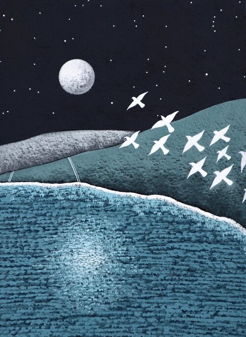 Любимые времена года этой английской художницы – осень и зима. Любимые цвета – приглушенный синий, теплая охра, черное и белое. Любимые образы – дом, птица, дерево, снег. Работает она с помощью смешанных техник, использует акриловые краски и тушь. Все выглядит просто и не очень ярко, но глазу в этих иллюстрациях хорошо. Когда их рассматриваешь, отдыхаешь душой и вспоминаешь, что есть просто снег, поле, дом и человеку может быть хорошо и спокойно без внешней причины. Хочется помечтать о чем-то спокойном и простом, даже когда заботы конца года, казалось бы, не дают никаких шансов на это. Наташа Ньютон (1976) живет в сельской провинции и рисует с ранних лет. Говорит, что помнит то ощущение, когда в детстве дарят новую коробку фломастеров и ты готовишься начать творить с их помощью. С 2013 года к Наташе пришла известность, после того, как она впервые загрузила свои работы в соцсеть и они вызывали интерес со стороны заказчиков, в том числе крупных издательств, которые начали пред