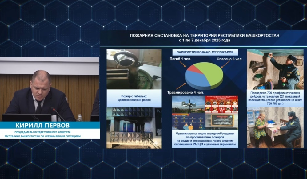 Жертвой происшествия стала 49-летняя жительница Давлекановского района. За прошедшую неделю, с 1 по 7 декабря, в Башкирии произошло 127 пожаров. Об этом на оперативном совещании в ЦУР РБ глава Госкомитета РБ по ЧС Кирилл Первов. Один из пожаров стал смертельным — в Давлекановском районе. Он возник из-за неосторожного приготовления пищи. Погибла 49-летняя местная жительница. Всего с начала года в республике произошел 7091 пожар. В пожарах погиб 181 человек. Фото: стоп-кадр трансляции ЦУР РБ.