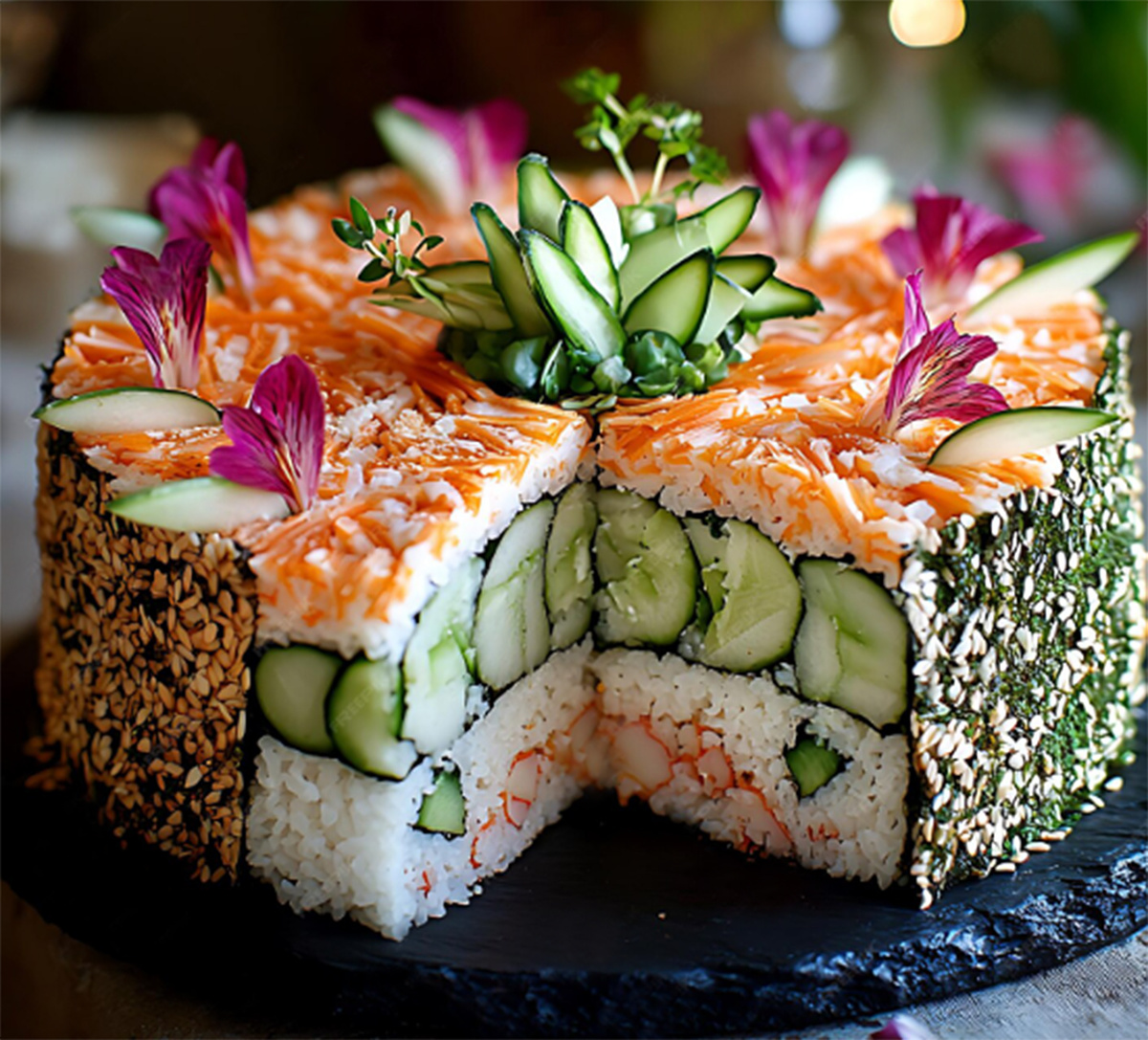 Совершая закупки продуктов к праздничному столу, не забудьте припасти круглозерный рис, листы нори, слабосоленый лосось, авокадо, свежий огурец, творожный сыр и рисовый уксус. Вы, конечно, догадались, для какого блюда нужны такие ингредиенты. Однако готовить мы будем ни суши, ни роллы, а изысканный закусочный торт. Главное и самое хлопотное в этом рецепте – сварить правильный рис. Важно, взять именно круглозерный. Достаточно будет стакана. Хорошо промыть крупу в холодной воде до исчезновения мути. Всыпать промытый рис в толстостенную кастрюлю, залить в нее полтора стакана холодной воды, накрыть крышкой, довести до кипения и варить на среднем огне до тех пор, пока не впитается в крупу вся влага. Затем отключить огонь и оставить кастрюлю с рисом на плите еще на 15 минут. Изображение блюда создано при помощи нейросети Приготовить заправку. Смешать в небольшой чашке 5 чайных ложек рисового уксуса с двумя такими же ложками сахара и ложкой соли. Подогреть смесь до полного растворения соли