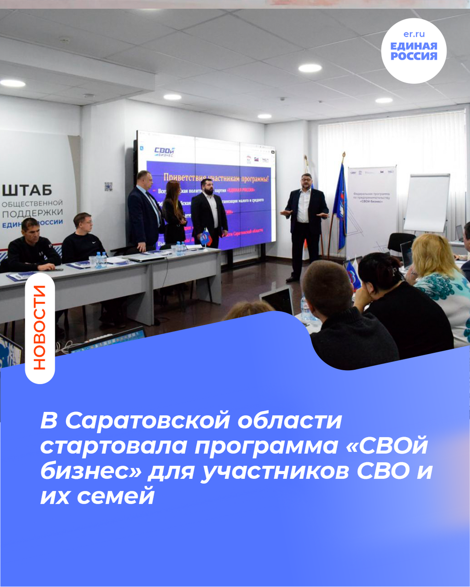 🔹Торжественное открытие обучающего курса состоялось сегодня, 8 декабря, на площадке регионального Штаба общественной поддержки «Единой России» Для ветеранов спецоперации и членов их семей, которые хотят открыть собственное дело или вернуться к предпринимательской деятельности, в Саратовской области стартовала федеральная программа «СВОй бизнес». Её проводят партия «Единая Россия», «ОПОРА РОССИИ» и Корпорация МСП при поддержке правительства региона.