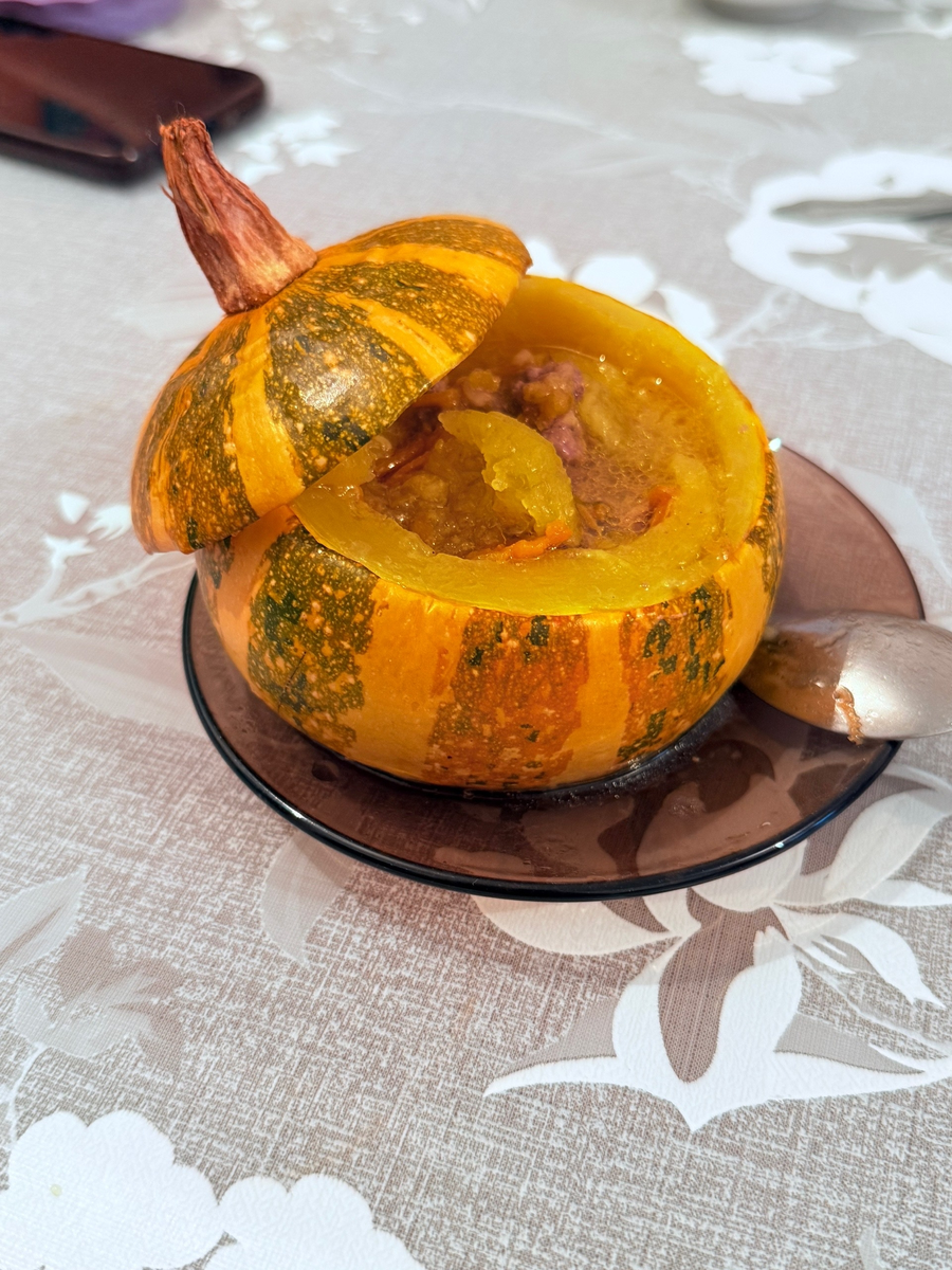 Иногда бывает такое настроение, когда хочется чего-то по-настоящему уютного… такого, что пахнет домом, теплом и небольшим праздником среди обычной недели. Вот у меня вчера было именно так, решила я приготовить фаршированные тыквочки «сквош» И, девочки… это получилось так вкусно, что я до последней ложки сидела и думала: «Почему я раньше так не делала?» Ингредиенты: тыквы «сквош»— 4 штуки говядина — 200 г картофель — 100 г лук — 30 г морковь — 30 г чеснок — 1 зубчик вода — 200 мл растительное масло — 1 ст. л. хмели-сунели — 0,5 ч. л. соль и перец — по вкусу Как готовила (и снова хочу): 1. Подготовка тыквочек - это как подготовка «домика» для нашего рагу. Помыла, срезала верхушку, получилась крышечка. Вынула семечки, оставила только плотную мякоть. Изнутри натёрла солью и чесноком, пусть постоит немножко, вкус набирает. 2. Мясо обжариваем до корочки. Порезала кусочками по 2 см, кинула на хорошо разогретую сковороду с маслом. Вот тут запах уже такой, что хочется есть прямо ложкой со ско