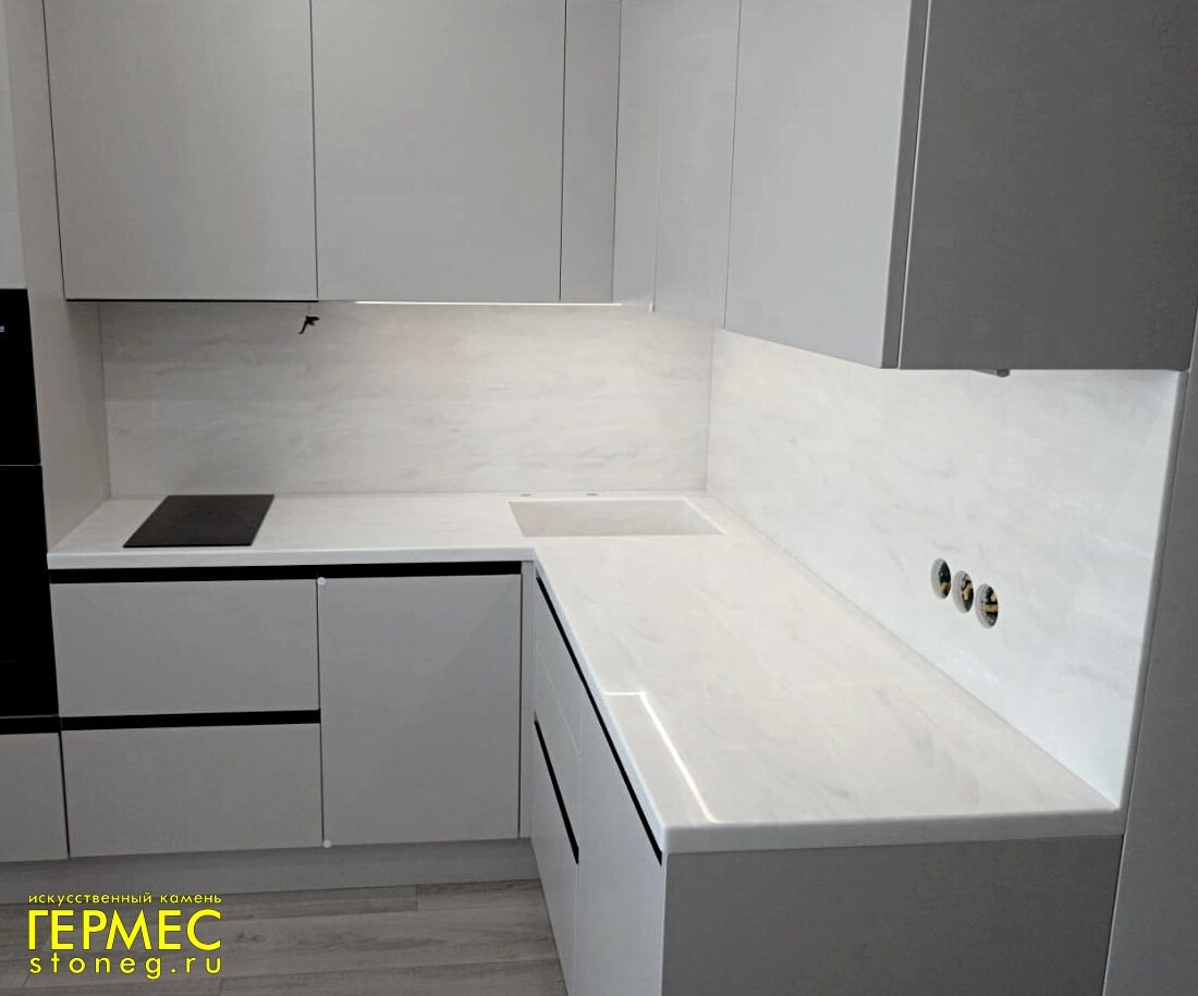 ✅ Наша работа. Кухонная столешница со стеновыми панелями из искусственного камня Primax M507 Tampico серо-белого цвета с мраморной текстурой. - Форма столешницы: угловая, г-образная. - Размеры: 1700х1867х595 мм. - Толщина: 38 мм. Подгиб: да. Борт: нет. - Кромка: радиусная. - Кухонная мойка: интегрированная из искусственного камня, модель MP10, размеры: 525х425 мм, глубина 200 мм. - Вырезы под варочную панель, слив, дозатор, смеситель. Стеновые панели, кухонный фартук, размеры: 1700х552, 1867х552 мм. Толщина: 12 мм. Вырезы под электрические розетки. 👉🏻 Расчёт стоимости проектов и заказ изделий: ☎ 8 (812) 336-34-22, 👉🏻 stoneg.ru/rasschitat-stoimost-proyekta https://dzen.ru/id/5f5b6f7c3d4e5b604091de0c