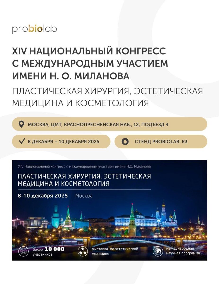 XIV национальный конгресс с международным участием имени Н.О. Миланова стартовал сегодня❤️ Это уже традиционное место для обмена профессиональной информацией между врачами разных специальностей, исследователями и учеными, так или иначе связанными с пластической хирургией, эстетической медициной и косметологией. А также это возможность: • Погрузиться в атмосферу пластической хирургии, эстетической медицины и косметологии; • Лично пообщаться с экспертами Probiolab; • Получить профессиональные рекомендации; • Узнать о тенденциях и новинках. 📍Москва, ЦМТ, Краснопресненская наб., 12, подъезд 4 📍СТЕНД PROBIOLAB: 26 Будем рады встрече! #probiolab #пластичекаяхирургия
