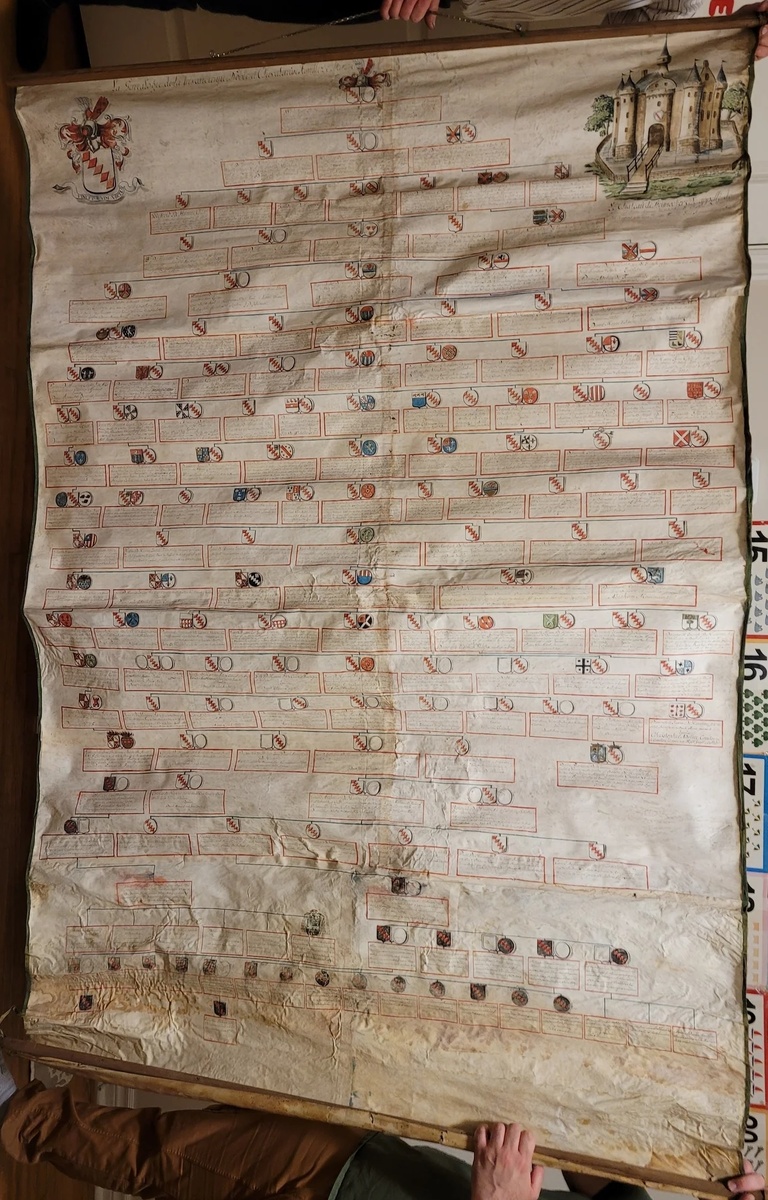 Благородный род ван Хамм, из фламандского Брабанта, возводит свою родословную к жившему в XI веке рыцарю Вотье Ле Вье сеньору де Хамм. Такая древность семьи заслуживает внушительной визуализации, что и было сделано на пергаменте в середине XVIII века. На представленной генеалогической схеме размещены не только имена и гербы, но и замечательный рисунок родового замка Château Hamm в Стиноккерзиле. Кстати, замок сохранился до наших дней, но был сильно перестроен за прошедшие столетия. Благородный род ван Хамм продолжается по сей день, но замок им уже не принадлежит. Любопытно, что в нижней части пергамента мы можем наблюдать добавления, сделанные во второй половине XIX века - в генеалогическую схему рода ван Хамм себя внёс кардинал Энгельберт Стеркс, примас Бельгии, указав себя внуком Гертруды ван Хамм. Такие генеалогические схемы чрезвычайно красивы и будут интересны генеалогам, геральдистам, историкам всех профилей, а последними изображены кардинал Стеркс и его герб. — Авто