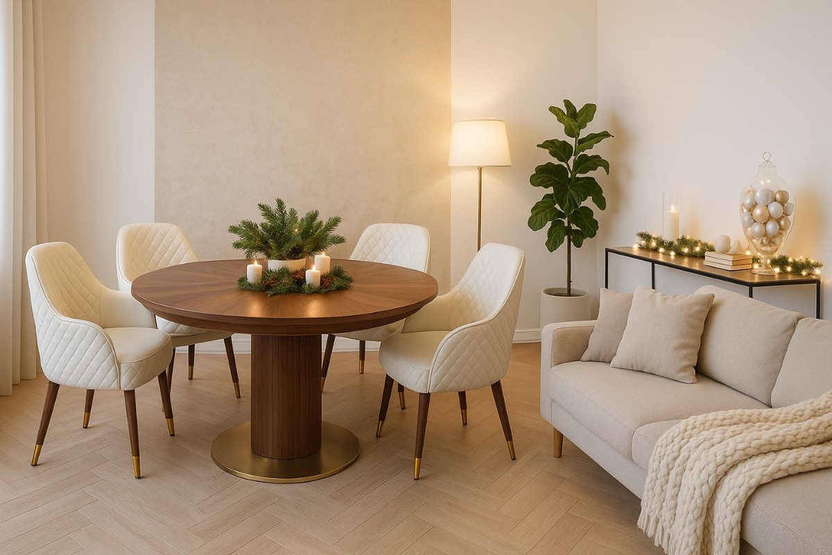 Наш стол и стулья в новогоднее интерьере Стол раздвижной Шпон американский орех и Отделка из нержавеющей стили сатин с нитридом титана Стол был в размере д 120см с раздвижкой до 150 см Стоимость такого стола была - 265 900 руб Повторим в любых размерах Пишите в телеграм @Art_interiors_bot Или на вацап 89099070387