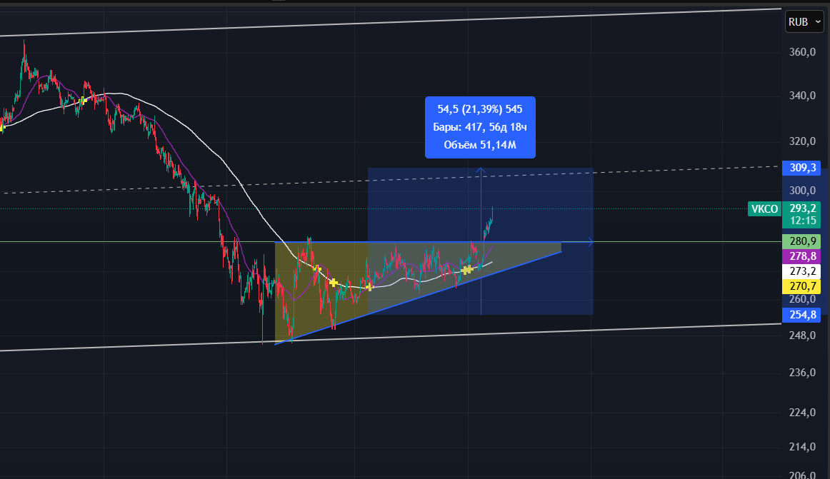 #ВК #VKCO 📉 На дневном тайме глобальный тренд нисходящий. 🔼 В данный момент цена идёт в канале на повышение, этот канал является частью флага, который пробивается в нижнюю стенку и отрабатывается на понижение цены.Сейчас цена двигается к верхней стенке фигуры, есть шанс дорасти до 380. 🕯 На двухчасовом тайме сформировали разворотную фигуру от нижней стенки флага - поджатие к уровню сопротивления 280, пробил и подтвердил фигуру, идёт отрабатывать. ✔️ Отработка фигуры примерно до 309 – здесь сильный уровень, так как это средний зеркальный уровень канала. Если 308 пробьет и закрепится, то увидим движение до верхней стенки. 👀 В моменте стоит искать сигналы в лонг, так как сейчас все указывает на рост. Не является инвестиционной рекомендацией В телеграм больше разборов, подключайся КВ_НА_ТАИТИ
