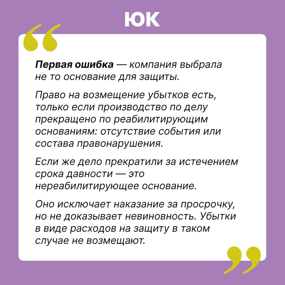 Две ошибки в спорах с государством: ВС дал подсказку, как компании возместить расходы на защиту ➡️ Компания потратила деньги на юристов, чтобы отменить штраф ГИБДД, и выиграла. Следующим шагом она попыталась взыскать эти расходы с государства — и тоже выиграла в трех инстанциях. Но Верховный суд отменил решения и отказал. Он назвал две ошибки, которые допустила компания. Транспортную компанию оштрафовали на 100 тыс. руб. за допуск к управлению пьяного водителя. Постановление вынесли заочно, без извещения. Компания наняла юриста, обжаловала штраф в суде общей юрисдикции и добилась его отмены. Производство по делу прекратили за истечением срока давности. Компания посчитала дело выигранным и подала иск к территориальному управлению МВД о взыскании расходов на услуги представителя. ⚖️ Что решили суды. Три инстанции встали на сторону компании. Они частично удовлетворили иск, взыскали деньги и признали: нарушения со стороны ГИБДД были, а расходы на юриста — это прямые убытки. ВС не сог