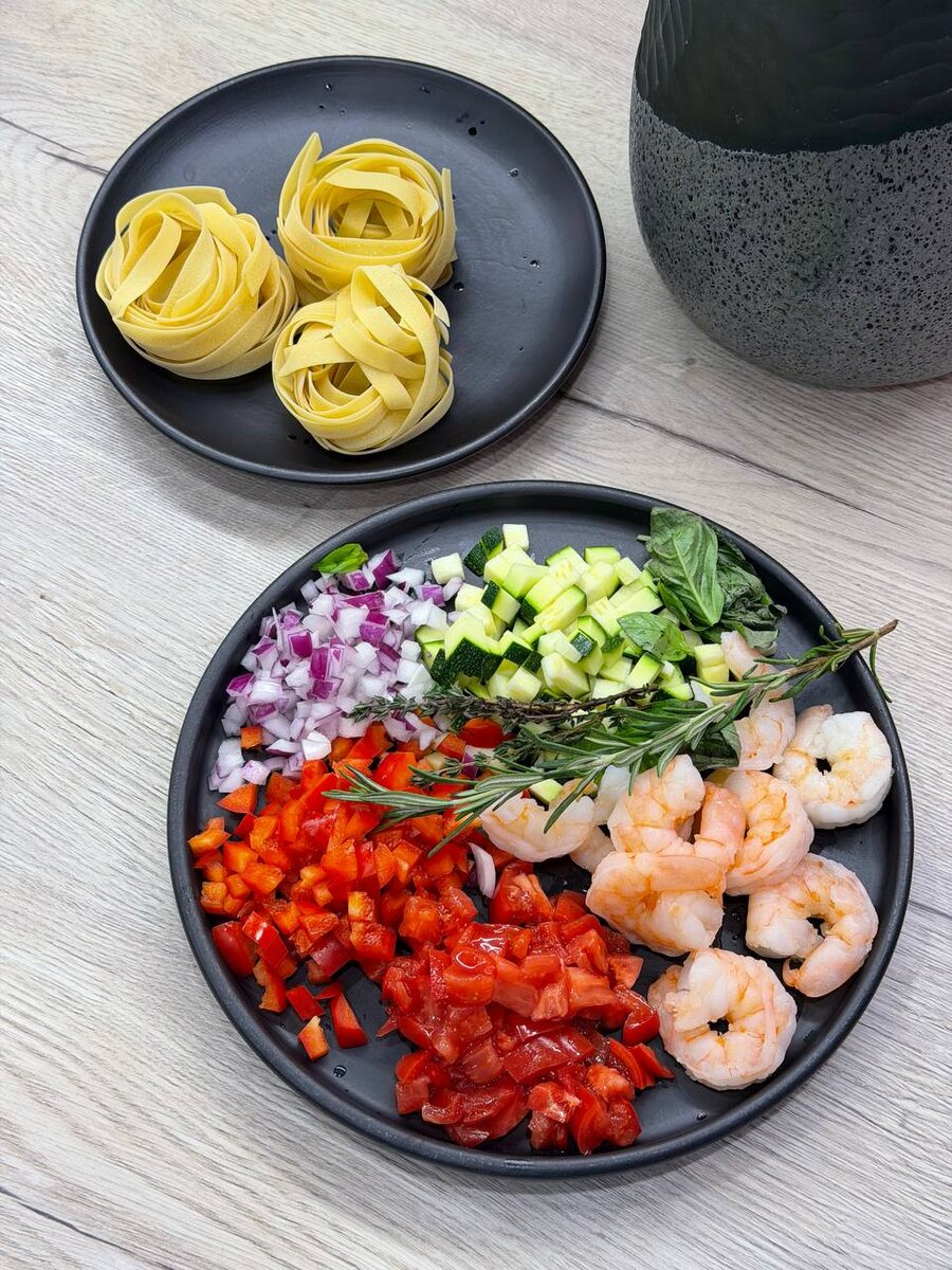 #KuzinCook на выходных готовил пасту в стиле Арабьята, только захотелось еще и добавить в соус овощей – вышло бомбически, особенно актуально, когда хочется чего-то острого, ароматного и невероятно вкусного. Готовится быстро, а впечатляет как блюдо из хорошего итальянского бистро. ⠀ Ингредиенты: паста (в оригинальном рецепте Пенне, но я взял паппарделле) — 250 г, очищенные креветки — 250–300 г, нарезаем один томат, половинку красного лука, красный перец и перец чили — по вкусу, оливковое масло, соль, сахар, петрушка, немного лимонного сока. ⠀ Как готовить: Отварите пасту до состояния al dente. На разогретом масле обжарьте лук, затем добавляем остальные овощи, измельчённый чеснок и чили до аромата. Добавьте креветки, готовьте 2–3 минуты, пока они не станут розовыми. Для насыщенности добавил еще несколько ложек натурального томатного соуса (можно взять томаты в собственном соку), посолите, при желании добавьте щепотку сахара для баланса. Тушите соус 7–10 минут, затем соедините с пастой и