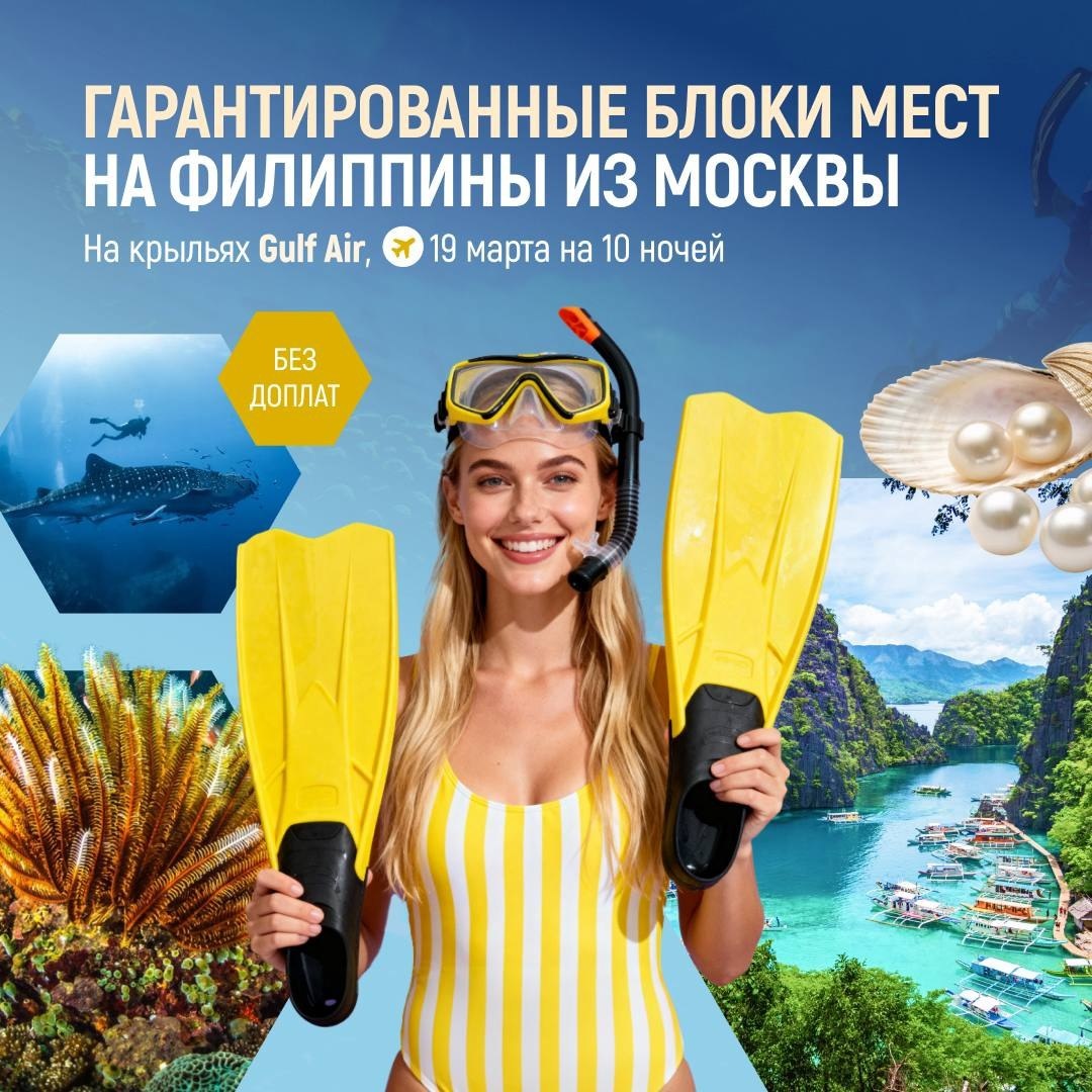 🇵🇭 Филиппины от 94 000 руб — это нечто! Архипелаг может дать фору даже Мальдивам, Багамам и Сейшелам. Бирюзовая вода, райские пляжи, джунгли, водопады, подводный мир, от которого дух захватывает… Если вам хочется настоящего тропического восхищения —🤩 Филиппины must-see! А теперь к лучшим новостям этого четверга 💥 Летим в 2026 из Москвы — 19 марта на 10 ночей БЕЗ ДОПЛАТ: ➡ Авиакомпания Gulf Air ➡ 1 стыковка через Манаму (Бахрейн) ➡ Длительность стыковок: 5 часов туда, 4 часа обратно ➡ Багаж: 25 кг + 6 кг ручной ➡ Питание и напитки включены Забронировать от 94 000р за ½ DBL