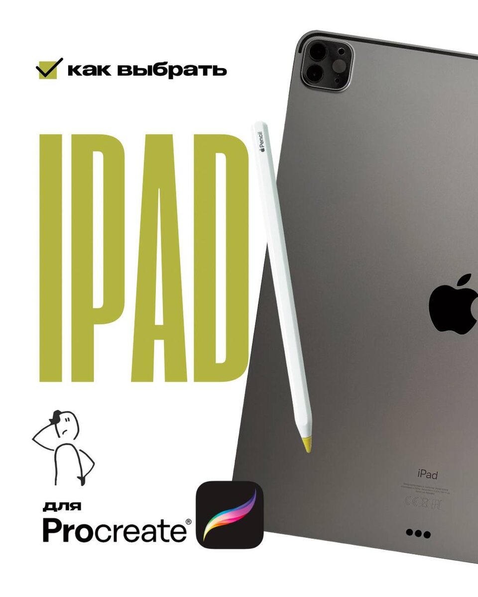 ? Вот что нужно знать, чтобы не ошибиться Это предновогодний Полезный Понедельник и особенно актуальный вопрос к Новому Году 🚨 Какой iPad выбрать для Procreate? Коротко и понятно 🙌🏻 ✅ Маленький факт для тех, кто выбирает iPad: Модели с кнопкой Home и стилусом 1-го поколения уже прошлый век. Последний такой iPad снят с производства в 2024 году. Если покупаете сейчас лучше смотреть на свежие модели без кнопки. ✅ Pro или Air? Для Procreate разницы нет. Количество слоёв одинаковое. ✅ Память 64 / 256 / 500 ГБ Эта цифра отвечает только за хранение файлов. На количество слоёв не влияет вообще. 🚨Важен только один показатель RAM RAM = сколько слоёв у вас будет в Procreate. Больше RAM, больше слоёв. Эту характеристику нужно гуглить для каждой модели. ✅ Когда стоит переплачивать? Только если берёте iPad Pro от 1 ТБ и выше. У этих моделей больше RAM, количество слоёв удвоится и работать вам будет комфортнее. ✅ Какой размер выбрать? ▪️ Если начинаете — маленький удобнее: лёгкий, мобиль