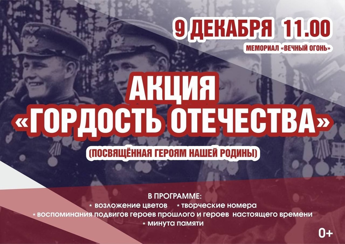 Приглашаем жителей города Чусового на акцию "Гордость Отечества" 📅 9 декабря 🕘️ 11:00 📍 Мемориал "Вечный огонь" 🎨 В программе: ✨ Возложение цветов ✨ Творческие номера ✨ Воспоминания подвигов героев прошлого и настоящего ✨ Минута памяти 📌 Возрастное ограничение: 0+ Присоединяйтесь, чтобы почтить память героев нашей Родины и выразить свою гордость за их подвиги!