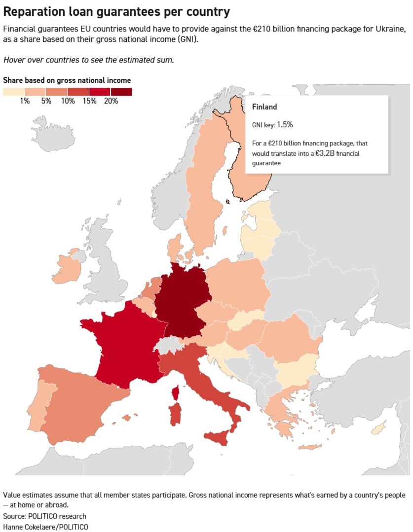 Politico: Странам ЕС необходимо будет по отдельности выделить миллиарды евро, чтобы гарантировать предоставление Украине срочно необходимых кредитов на сумму до 210 миллиардов евро, а Германия должна будет предоставить поддержку в размере до 52 миллиардов евро. На прошлой неделе Европейская комиссия представила дипломатам ошеломляющие суммы после объявления о предоставлении Украине репарационного кредита в размере 165 миллиардов евро, в который будет входить наличная стоимость замороженных российских активов. Финансовые гарантии, которые будут пропорционально распределены между странами блока, необходимы для получения одобрения на кредит от премьер-министра Барта де Вевера. Бельгийский лидер выступил против использования суверенных российских активов, опасаясь, что его стране в конечном итоге придётся в одиночку возвращать деньги Москве. Около 185 млрд евро замороженных российских активов находятся под управлением брюссельского финансового депозитария Euroclear, в то время как ещё 25