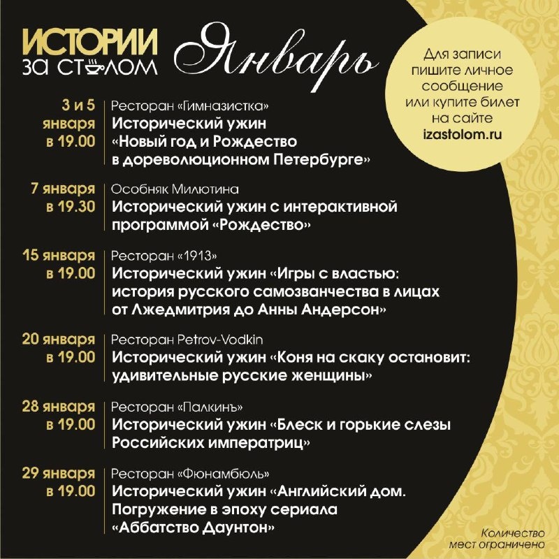 Публикуем нашу афишу января. Знаем вы ждали😍 Как всегда постарались соединить премьеры с самыми популярными ужинами. Записывайтесь заранее, пожалуйста, особенно на темы-хиты🔥 Для записи пишите @AnnaShuniaeva или купите билеты на сайте izastolom.ru 📍P.s Если у вас есть пожелания по темам, датам в феврале, пишите в комментарии. Также напоминаем, что если у вас компания от 8 человек, то мы можем принять ваши пожелания по теме и дате с привлечением на нее наших гостей и сохранением для вас стандартной стоимости.