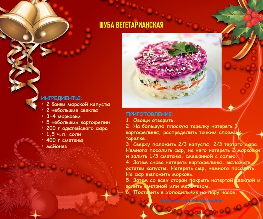 🥗 ШУБА ВЕГЕТАРИАНСКАЯ 🌀 ИНГРЕДИЕНТЫ: 2 банки морской капусты (несколько листов нори) 2 небольшие свеклы 3-4 морковки 5 небольших картофелин 200 г адыгейского сыра 1,5 ч.л. соли 400 г сметаны майонез домашний 🌀 ПРИГОТОВЛЕНИЕ: Овощи отварить. На большую плоскую тарелку натереть 3 картофелины, распределить тонким слоем на тарелке. Сверху положить 2/3 капусты, 2/3 тертого сыра. Немного посолить сыр, на него натереть 2 морковки и залить 1/3 сметаны, смешанной с солью. Затем снова натереть картофелины, выложить остатки капусты. Натереть сыр, немного посолить. На сыр выложить морковь. Затем со всех сторон покрыть натертой свеклой и залить сметаной или майонезом. Поставить в холодильник на пару часов.