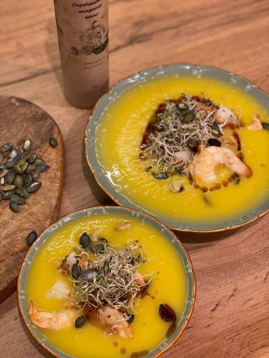 Вот идеальная с точки зрения нутрициологии тарелка. Тут тыквенный суп-пюре с креветками и щедрой горкой микрозелени, тыквенными семечками и каплей тыквенного масла 🙌🏼 Вчера писала о том, куда добавлять микрозелень? А сегодня вам живой и вкусный пример! 🧡 Как нутрициолог, я стараюсь вносить в свой рацион блюда, где вкус, польза и красота в идеальном балансе. Этот суп — мой хит в холодное время года: 🎃Тыква— бета-каротин для кожи, зрения и иммунитета. 🧄 Аромат и защита: Чеснок— природный антибиотик (аллицин) и мощный пребиотик для здоровья кишечника и иммунитета. 🦐 Белок: Креветки— легкий протеин, цинк и селен. 🌱 Микрозелень— живой витаминный взрыв и хлорофилл для детокса. -Тыквенные семечки— магний для спокойствия, цинк и полезные жиры. -Тыквенное масло (холодного отжима) — незаменимые жирные кислоты и витамин Е для красоты и гормонального баланса. Вместе они создают идеальную синергию вкусов, текстур и нутриентов. Это не просто суп, а полноценный и очень сытный приём пищи с