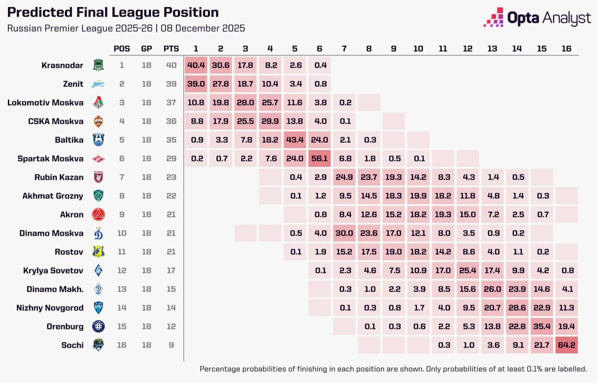 Opta считает, что по итогам сезона мы будем на 7-10 месте - проценты довольно размыты в этом промежутке. А вот вероятность стать пятыми оценили в 0,4%. Попасть в стыки вероятность больше - 1,9%. ❤️ Злобный Рубин ❤️