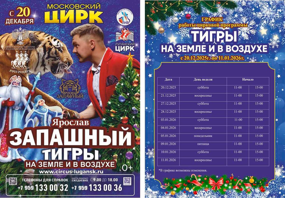 🎪 В Луганский цирк приезжает Новогодняя программа с Ярославом Запашным! 🎄 🗓 С 20 декабря по 11 января в цирке пройдут праздничные гастроли с уникальным аттракционом «Тигры на земле и в воздухе» 🐅✨ Гостей ждут: • Дед Мороз и Снегурочка 🎅❄️ • Воздушные гимнасты, акробаты, жонглёры • «Колесо Смелости» и эквилибристика • Грациозные лошади и яркие номера артистов • Новогодняя атмосфера и сказочная ёлка 🌲 В программе — лауреаты международных фестивалей и заслуженные артисты России. 🎟 Стоимость билетов от 500 до 1200 ₽. Продажа откроется в ближайшее время! ————— Поддержите канал Подпиской на "Сыны Отечества" или Голосом за канал ✅ подписаться |⚡️проголосовать 📲Наш проект в социальных сетях: Вконтакте, Одноклассники, Дзен, RuTube Теперь мы и в МАХ!