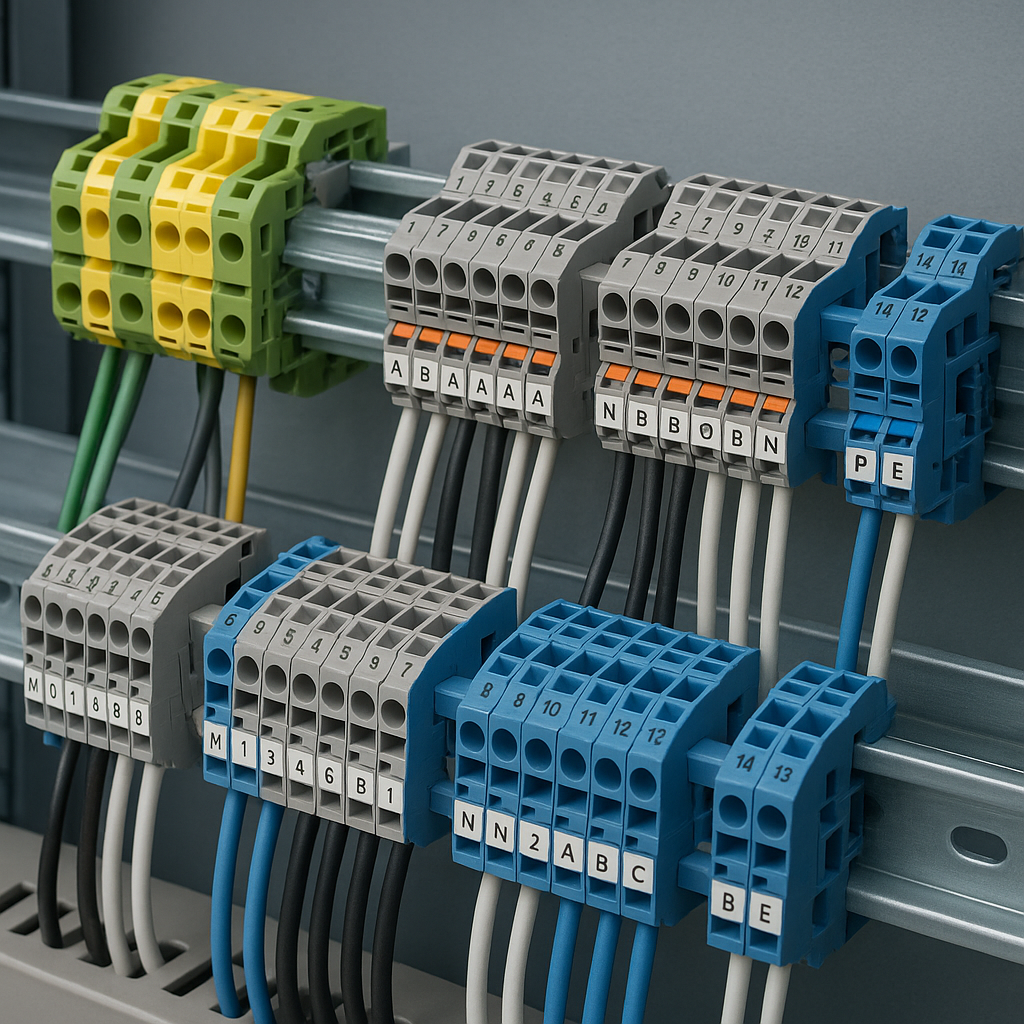 Клеммные колодки — стандартный элемент щитов автоматики, обеспечивающий надёжные соединения. Их неправильный монтаж — источник перегрева, ненадёжных контактов, отказов. Ниже — уточнённый порядок монтажа, основанный на стандартах и отраслевой практике. 1. Выбор клемм с учётом нагрузки и требований стандарта Клеммная колодка должна соответствовать по номинальному току, напряжению, сечению проводника и типу цепи (сигнальная / силовая / заземляющая). Истинное соответствие минимизирует сопротивление контакта и риск перегрева. Если используется DIN-рейка стандарта ГОСТ Р МЭК 60715-2003 — нужно выбирать клеммники, сертифицированные для установки на неё. Для цепей PE / N желательно использовать отдельные заземляющие клеммы с соответствующей изоляцией и маркировкой, чтобы не смешивать сигнал и защиту. 2. Подготовка основания: установка DIN-рейки Рейку монтируют ровно, с твёрдым креплением к панели шкафа — вибрация рейки под нагрузкой приводит к ослаблению контактов. При монтаже тяжёлых соста
