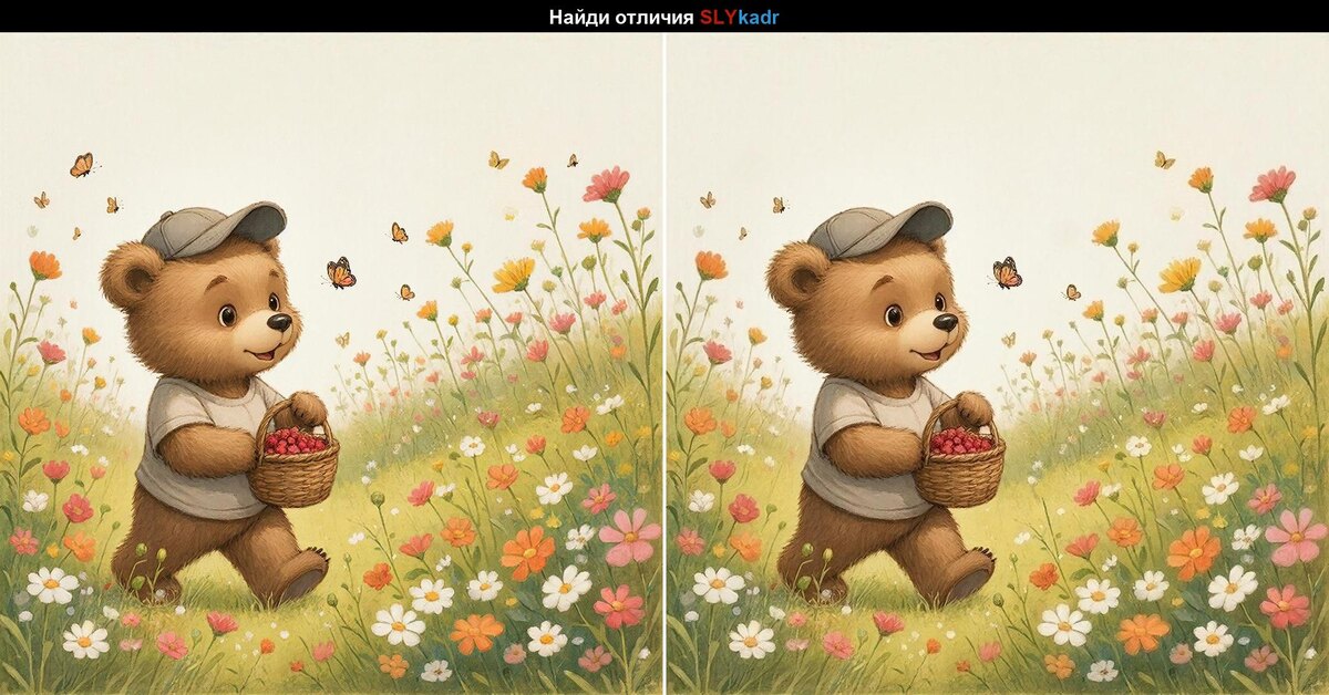 Привет, друзья! Это канал "Хитрый кадр", и мы рады видеть вас в нашей новой игре "Найди отличия"! Сегодня мы предлагаем вам увлекательное задание с милым медвежонком, который гуляет по цветущему полю. Ваше задание — найти все отличия на двух картинках. Готовы? Внимание, в каждой детали скрыта загадка! Как вам игра? Сколько отличий вы нашли? Делитесь в комментариях своим результатом и не забывайте подписываться на наш канал, чтобы не пропустить новые увлекательные задания! Удачи в поисках и до новых встреч на "Хитром кадре"! Ниже отгадка. 🎈