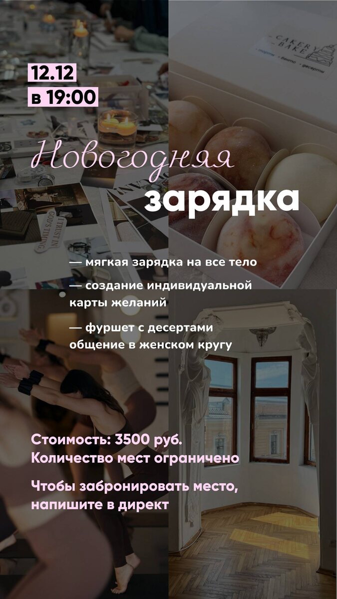 Уже в эту пятницу мы с Зарядочным клубом встречаемся на новогоднюю мини-вечеринку 🎄 💫У нас свободно 2 места и я приглашаю вас тоже присоединиться к нашему мероприятию, даже если вы ещё не в клубе 💫❤️ Что в программе: 💫зарядка-тренировка в нашем любимом формате, приятно подвигаем все тело 💫угощения, вкусности, напитки 🥂 💫визуализируем желания на будущий год и создаем карту желаний 💫общаемся в приятном женском кругу 💫 Когда? 12.12 пятница 19:00-21:30 Предоплата 1500р Полная стоимость 3500р Запись и вопросы в личные сообщения @aleksa_panova 💫